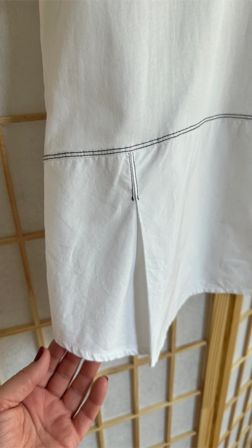 This is Zara cotton t-shirt with a contrasting stitched panel near the hem. Fits size M. Worn 1 time, almost new.