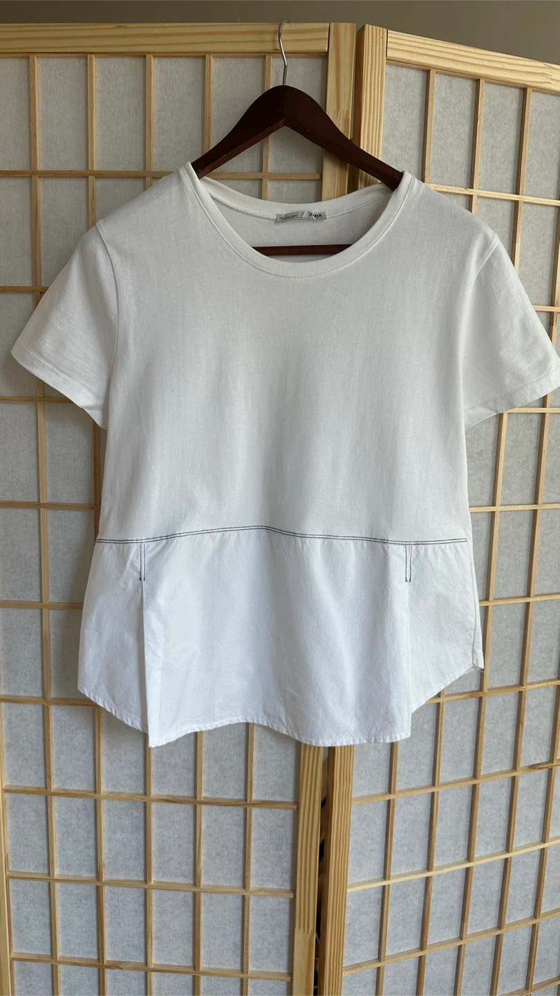 This is Zara cotton t-shirt with a contrasting stitched panel near the hem. Fits size M. Worn 1 time, almost new.