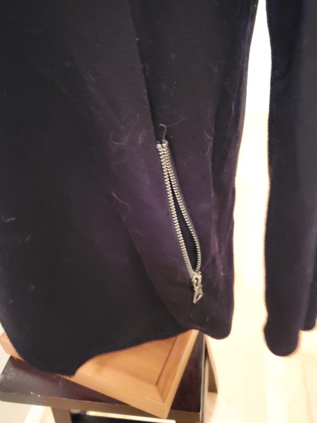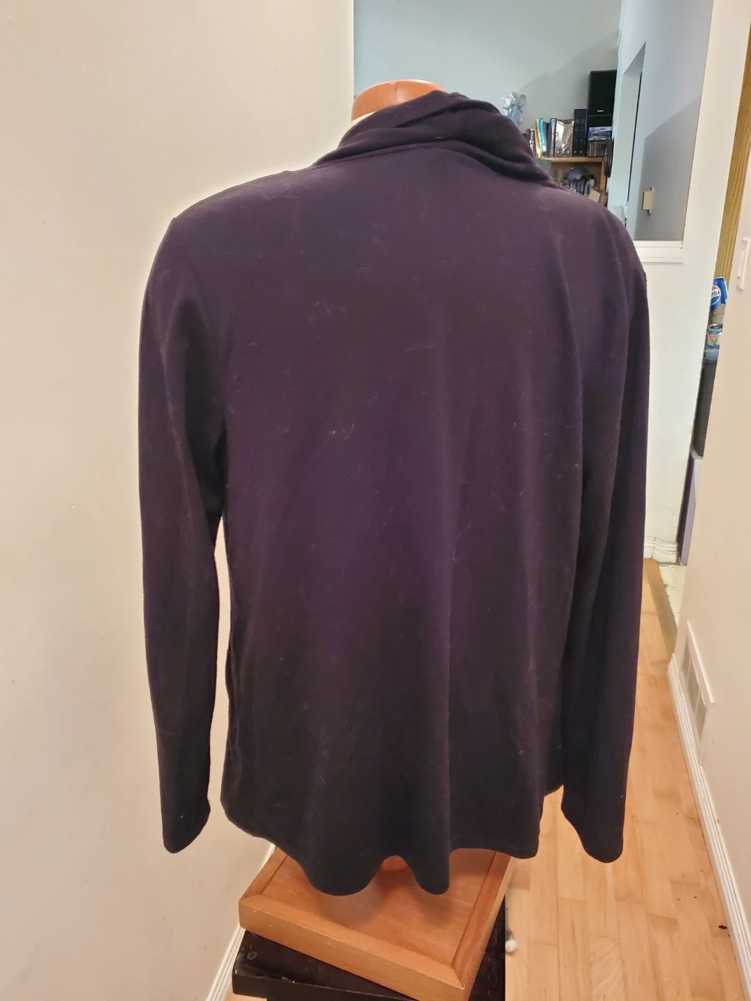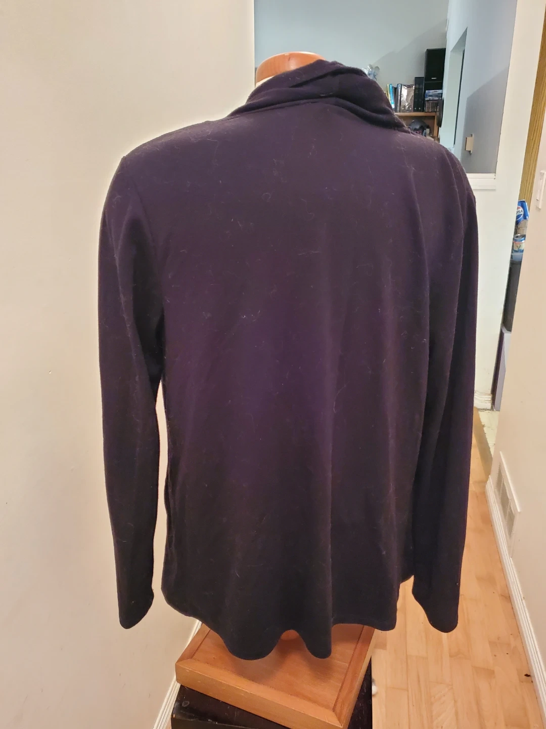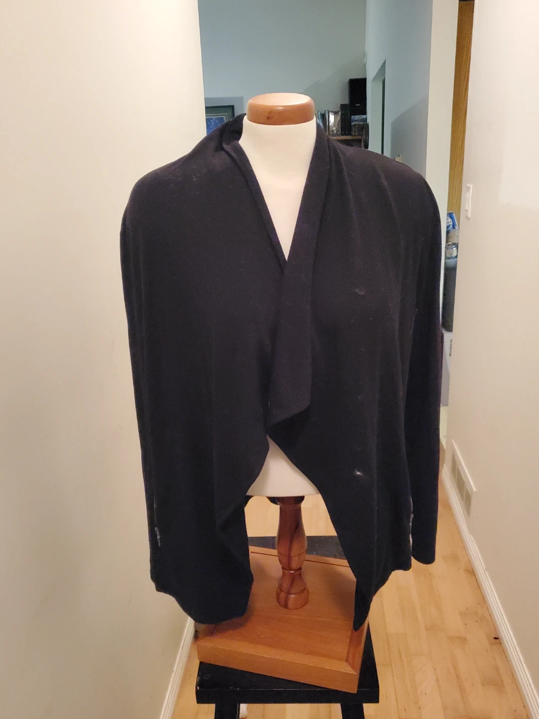 This is a black open-front cardigan with a waterfall collar. It has zippered accents on the sides. It's a versatile layering piece for many outfits. Cedar pick up. Size Medium.