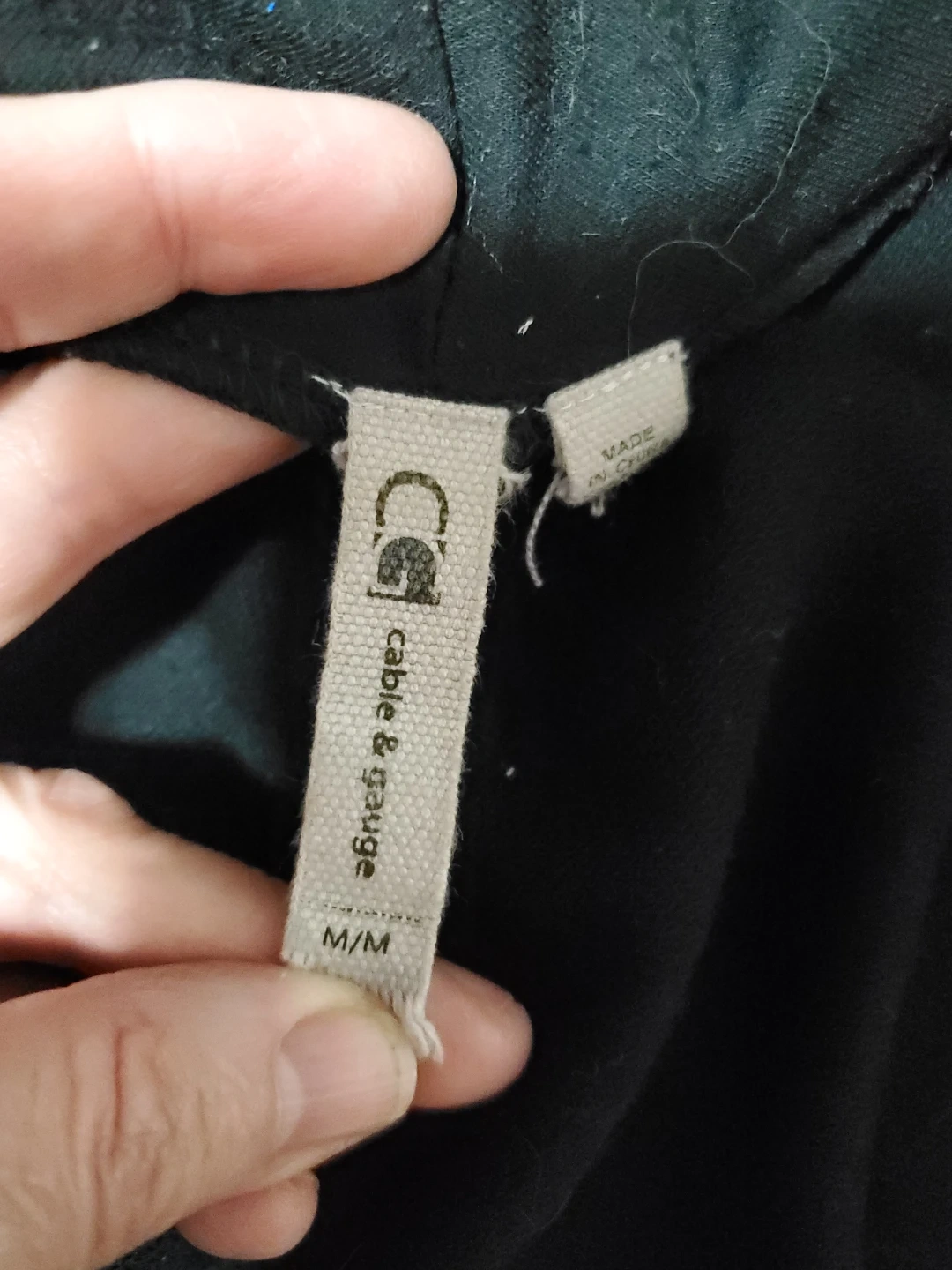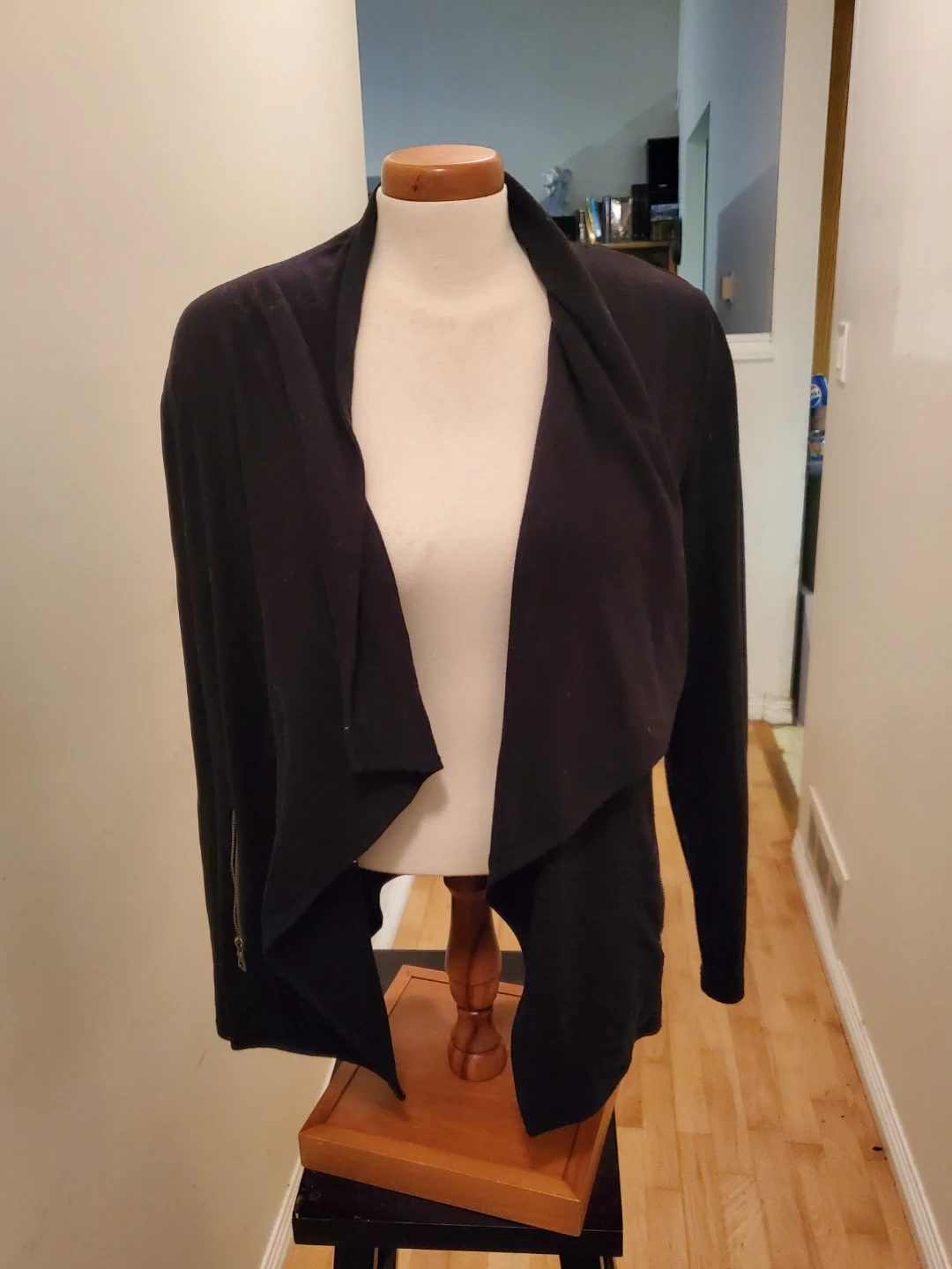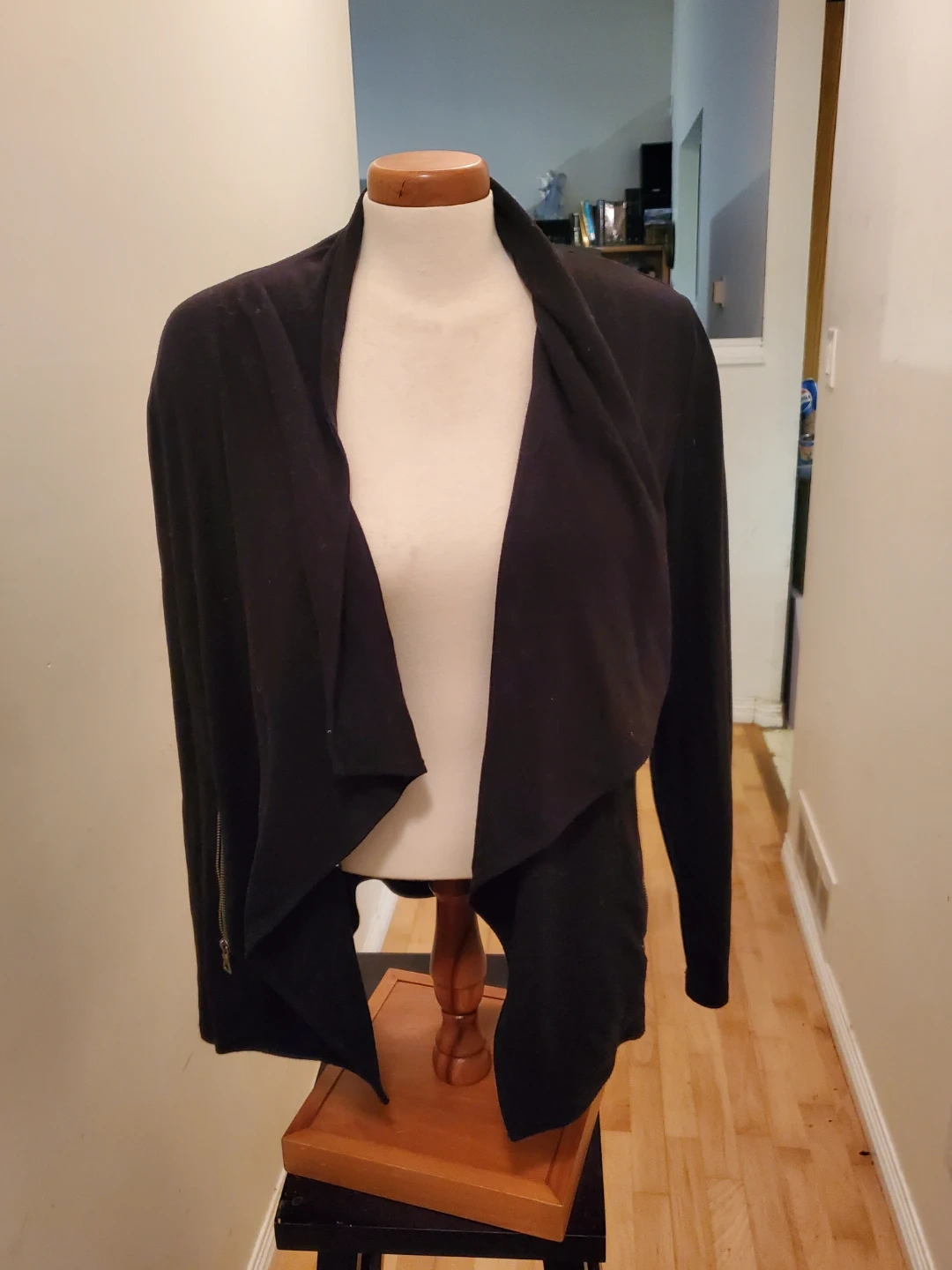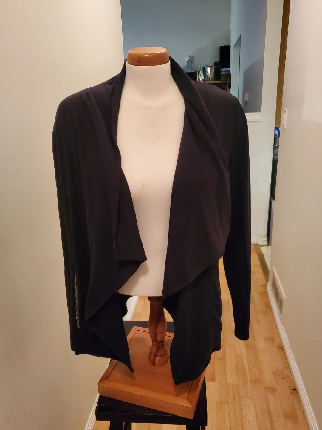 This is a black open-front cardigan with a waterfall collar. It has zippered accents on the sides. It's a versatile layering piece for many outfits. Cedar pick up. Size Medium.
