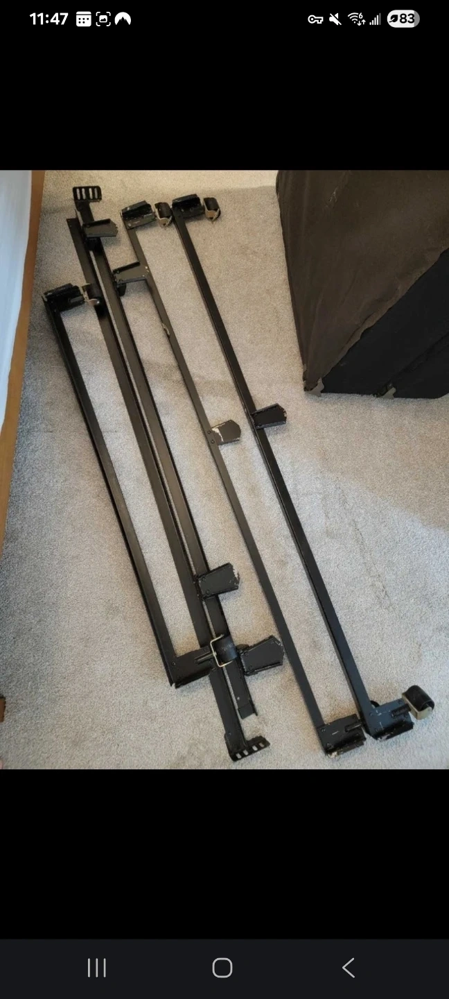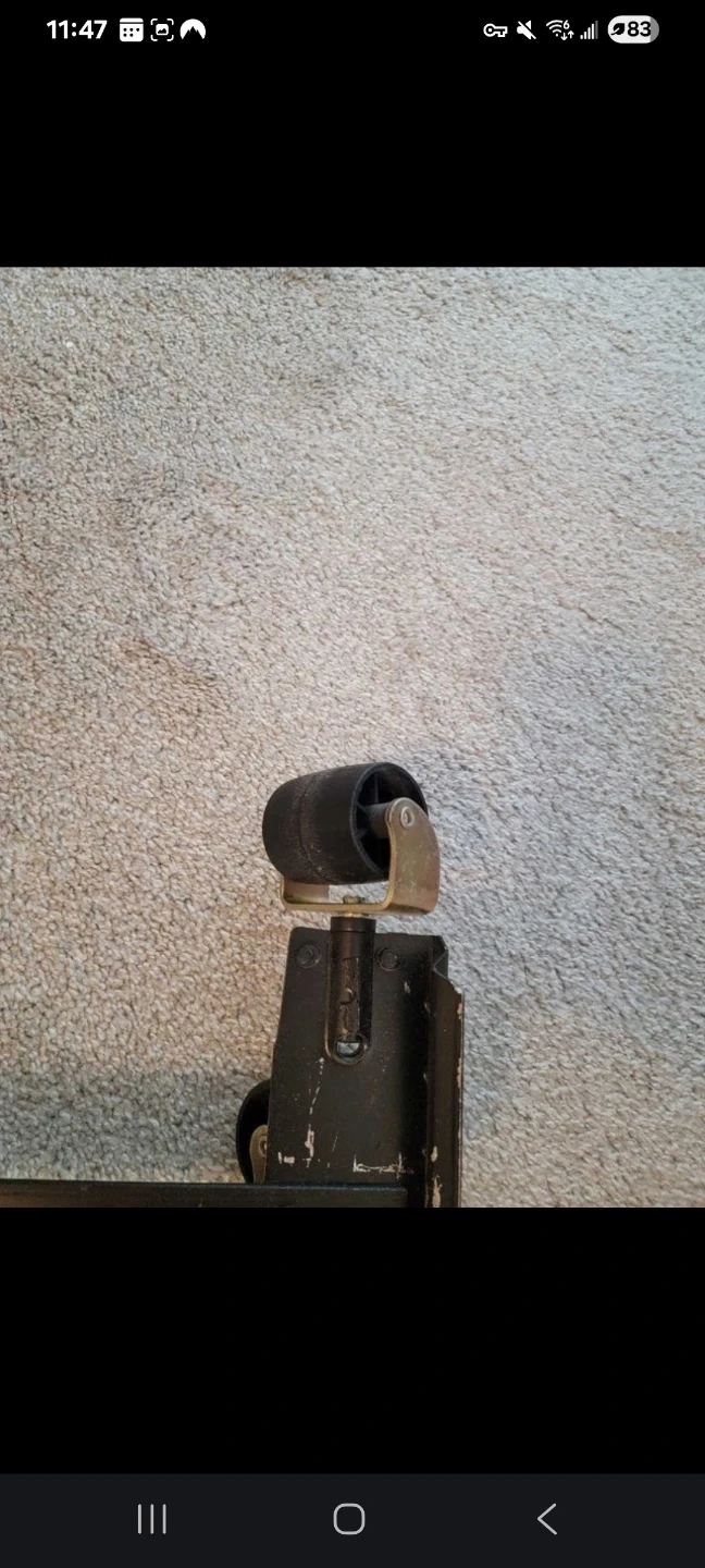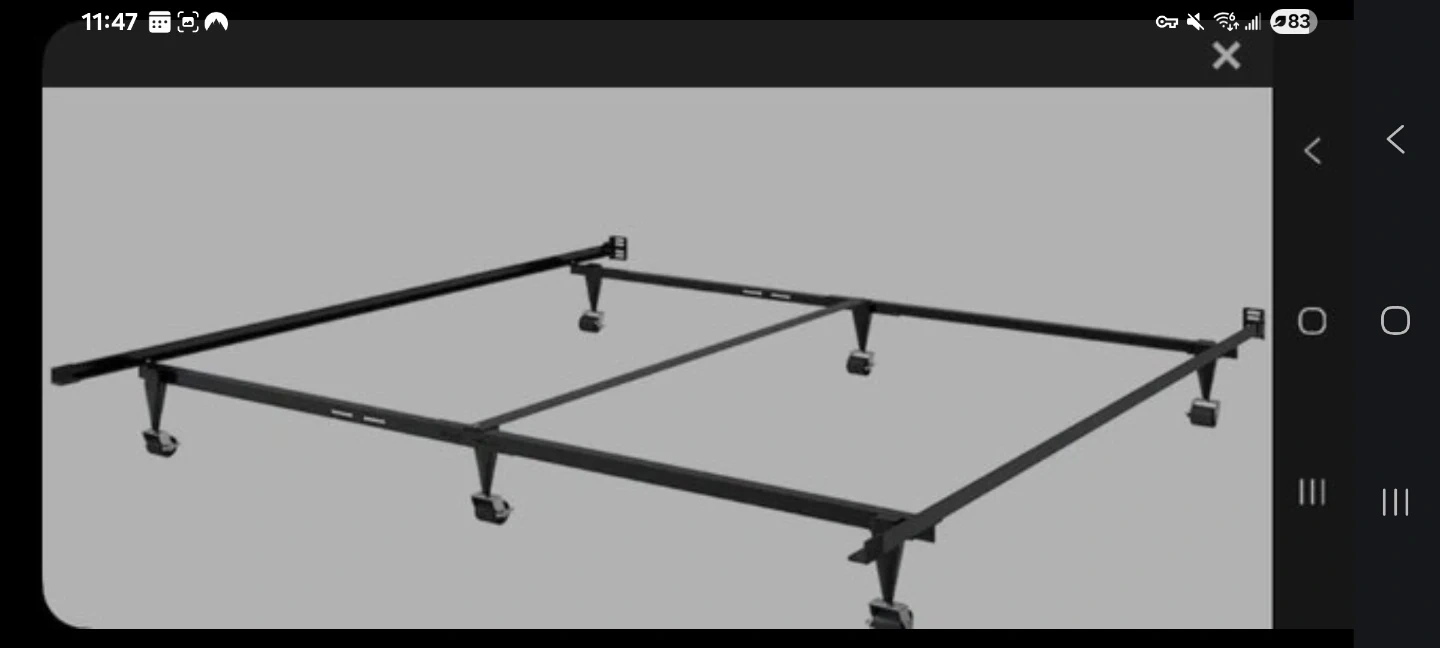 This is a metal bed frame with wheels. It's a sturdy construction, suitable for supporting a mattress. Includes centre support legs and adjustable headboard brackets.