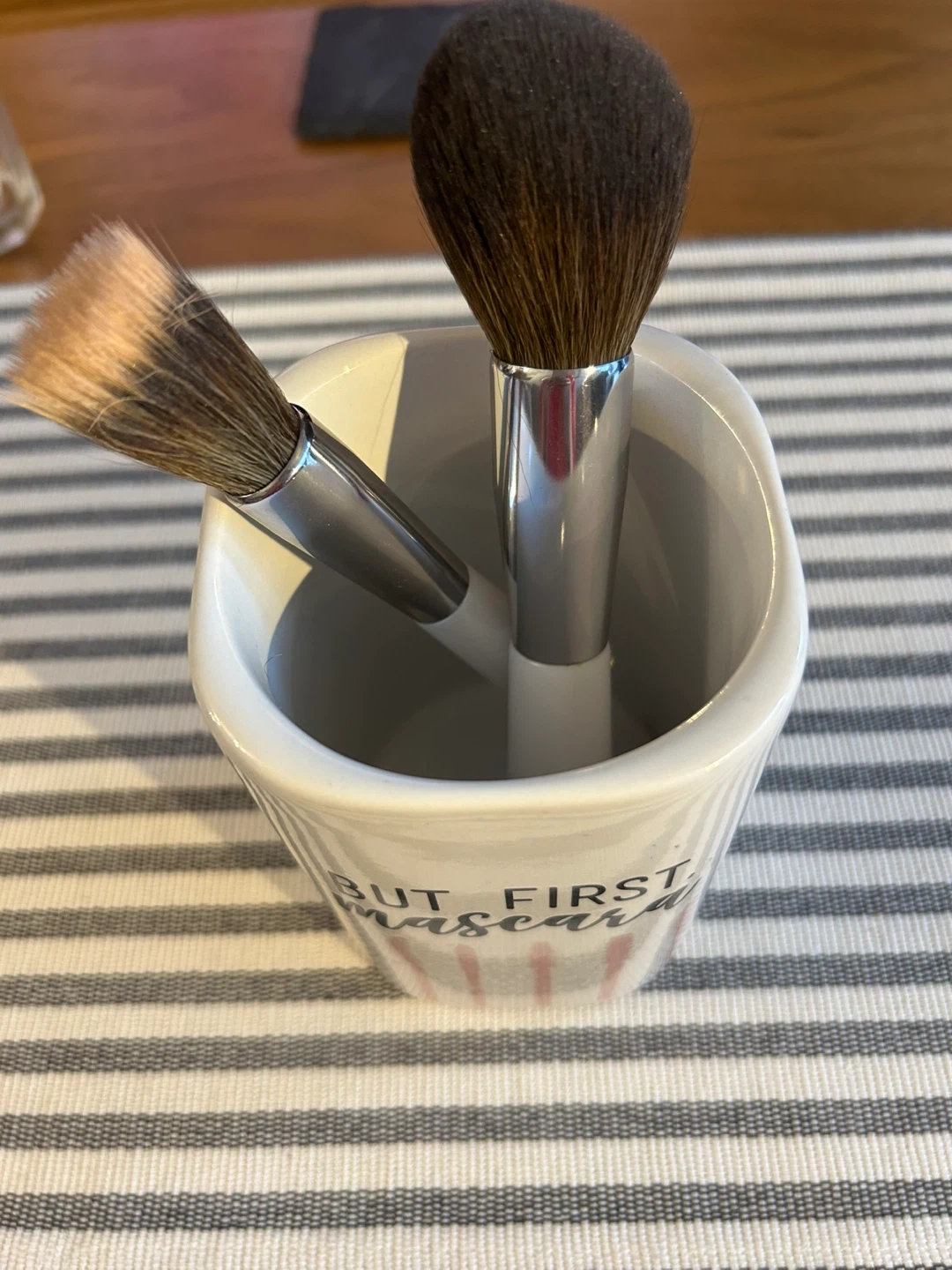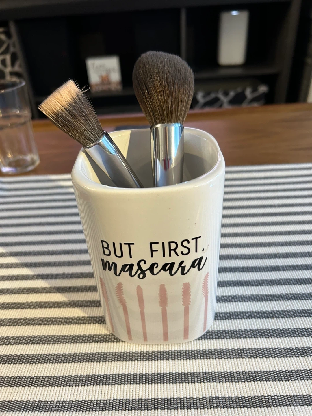 This is a white ceramic holder for makeup brushes. It has 'BUT FIRST, mascara' printed on the front with small mascara wand graphics. It's perfect for organizing your makeup brushes on a vanity. Cleaning out & no longer need.