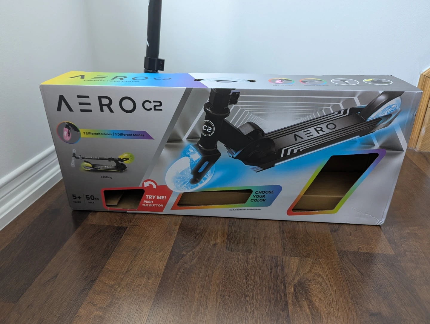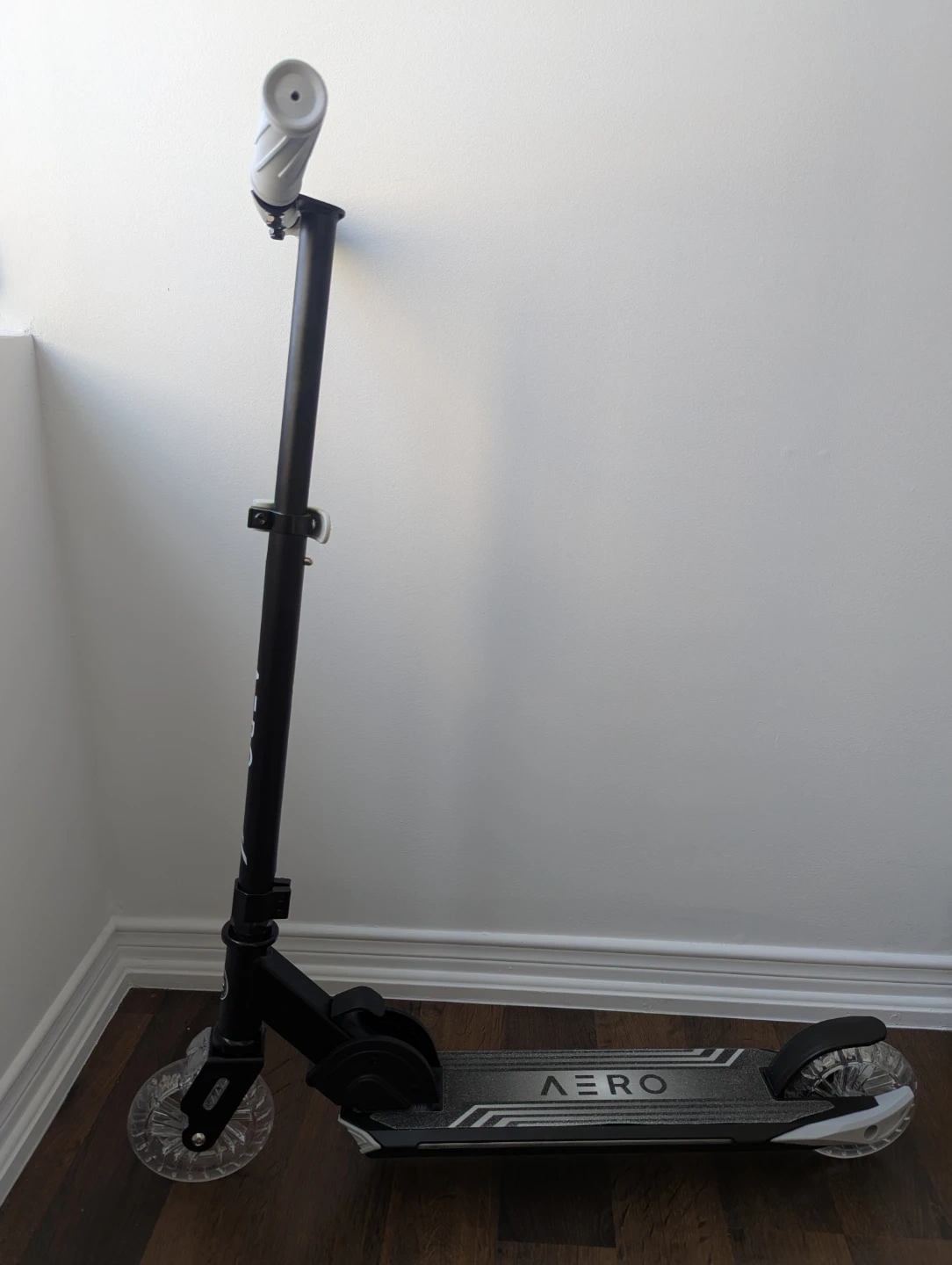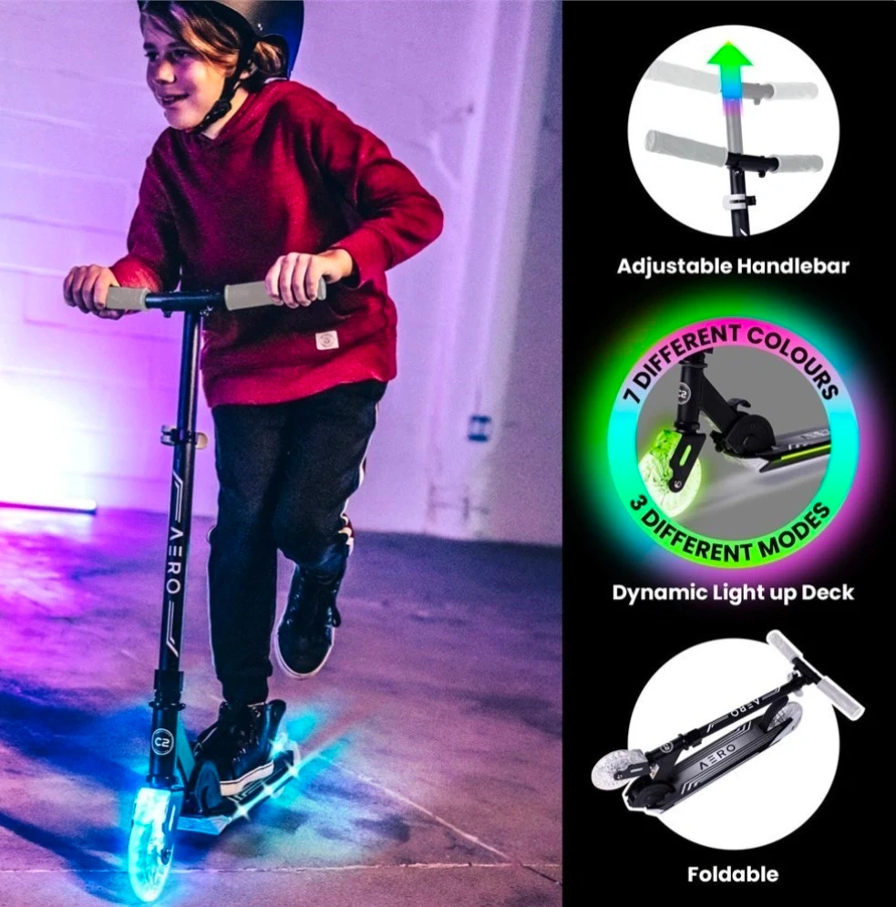 This AERO C2 scooter features a dynamic light-up deck with 7 different colours and 3 different modes. It also boasts light-up wheels that come in various colours. The handlebar is adjustable for your comfort and it's foldable for easy storage and transport. Great for kids and teens to enjoy!
