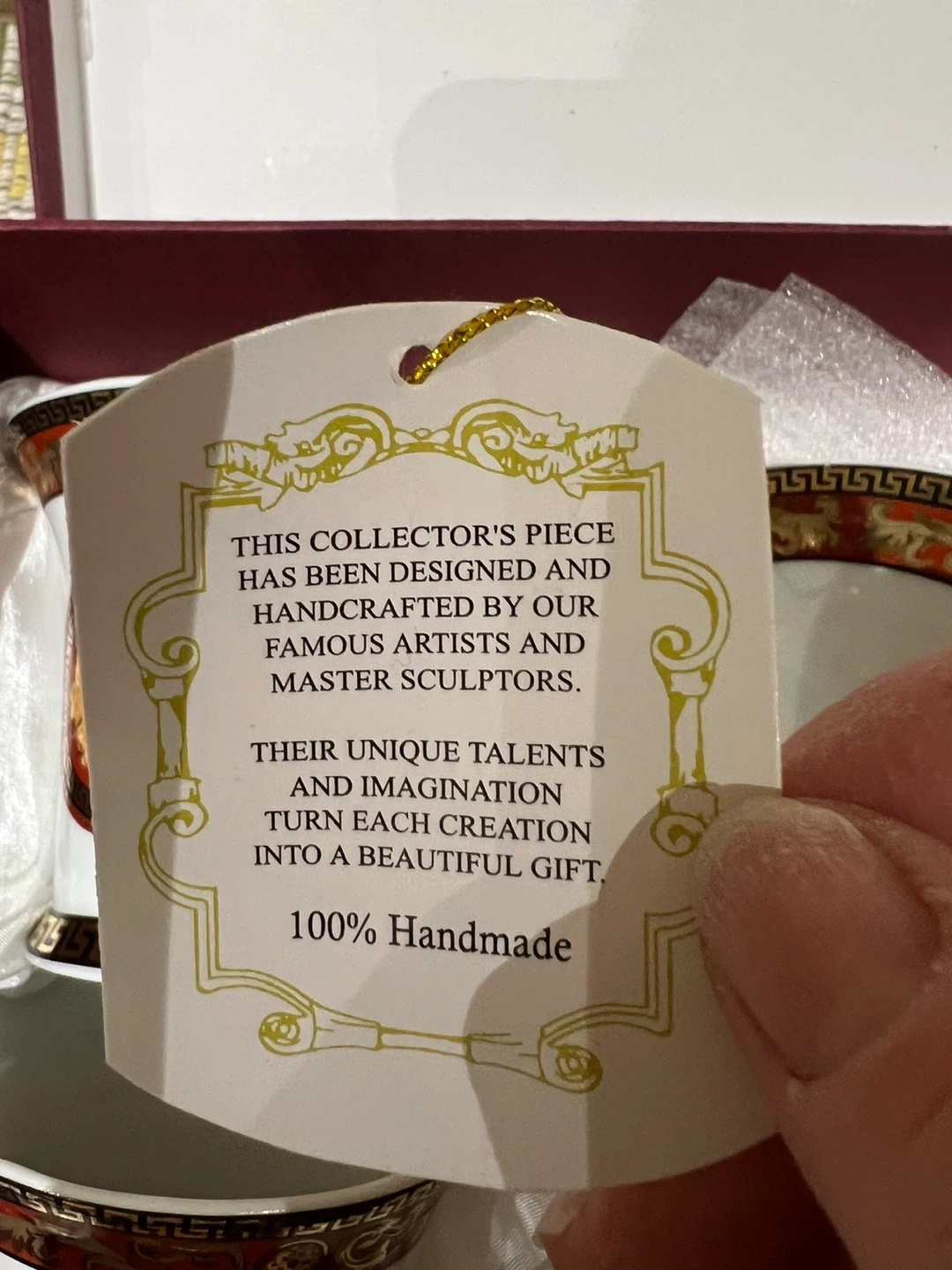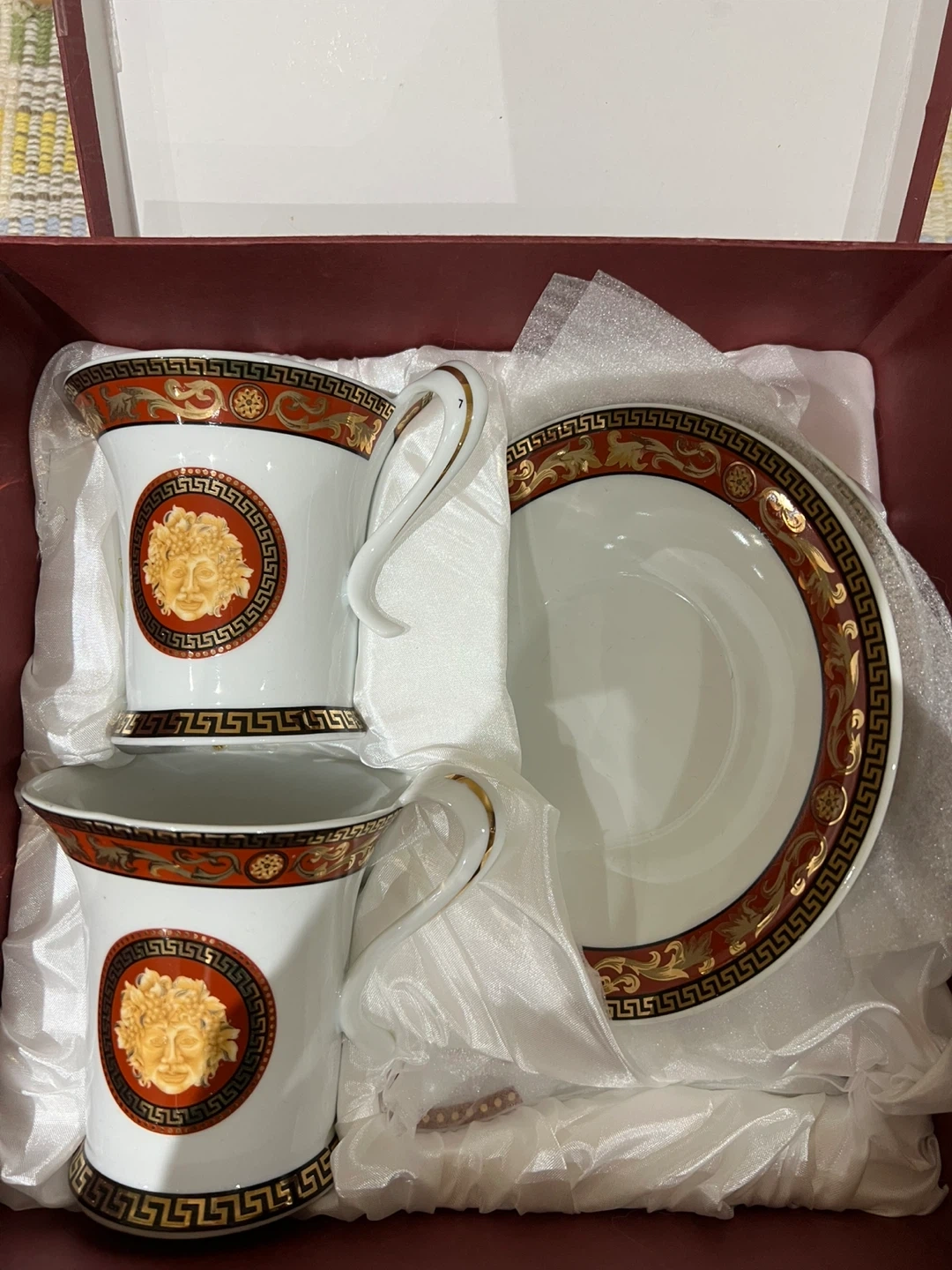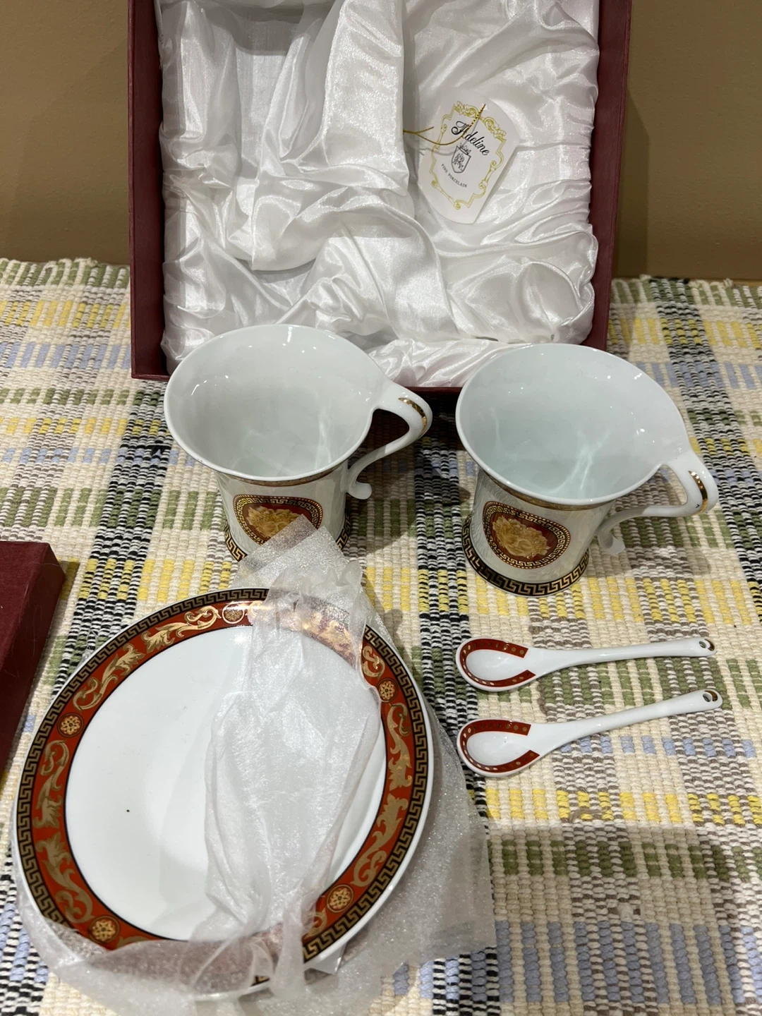 A set of two Adeline Fine Porcelain tea cups and a matching saucer, presented in its original box. It's beautifully designed with intricate detailing. This collector's piece is 100% handmade.