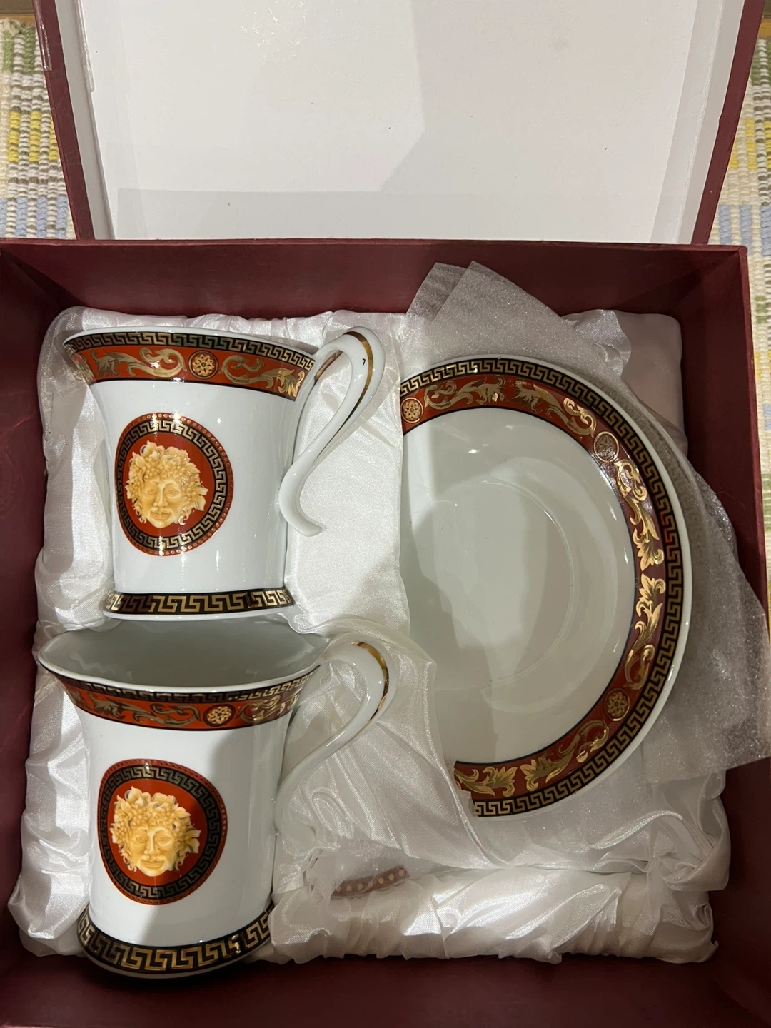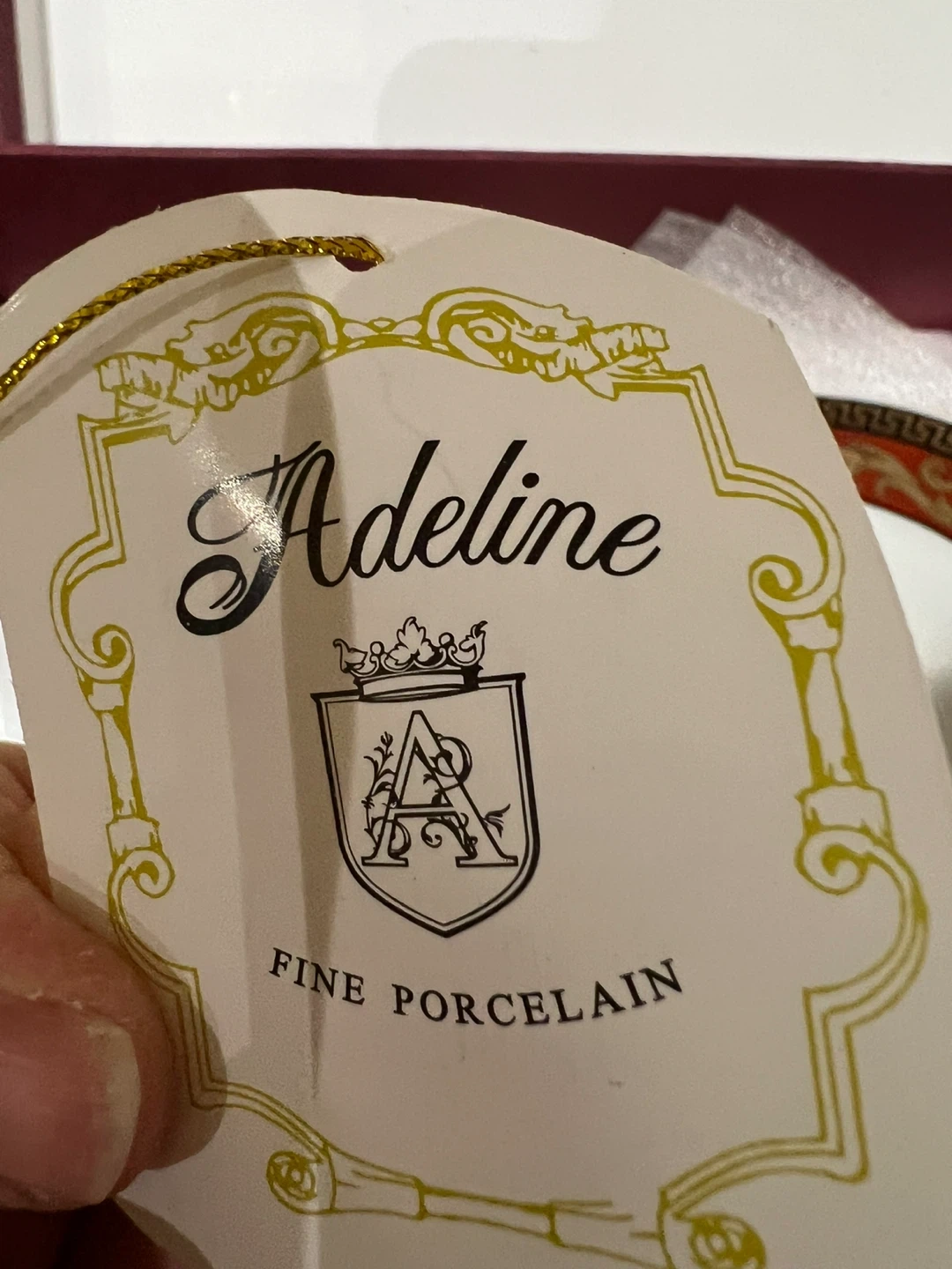 A set of two Adeline Fine Porcelain tea cups and a matching saucer, presented in its original box. It's beautifully designed with intricate detailing. This collector's piece is 100% handmade.