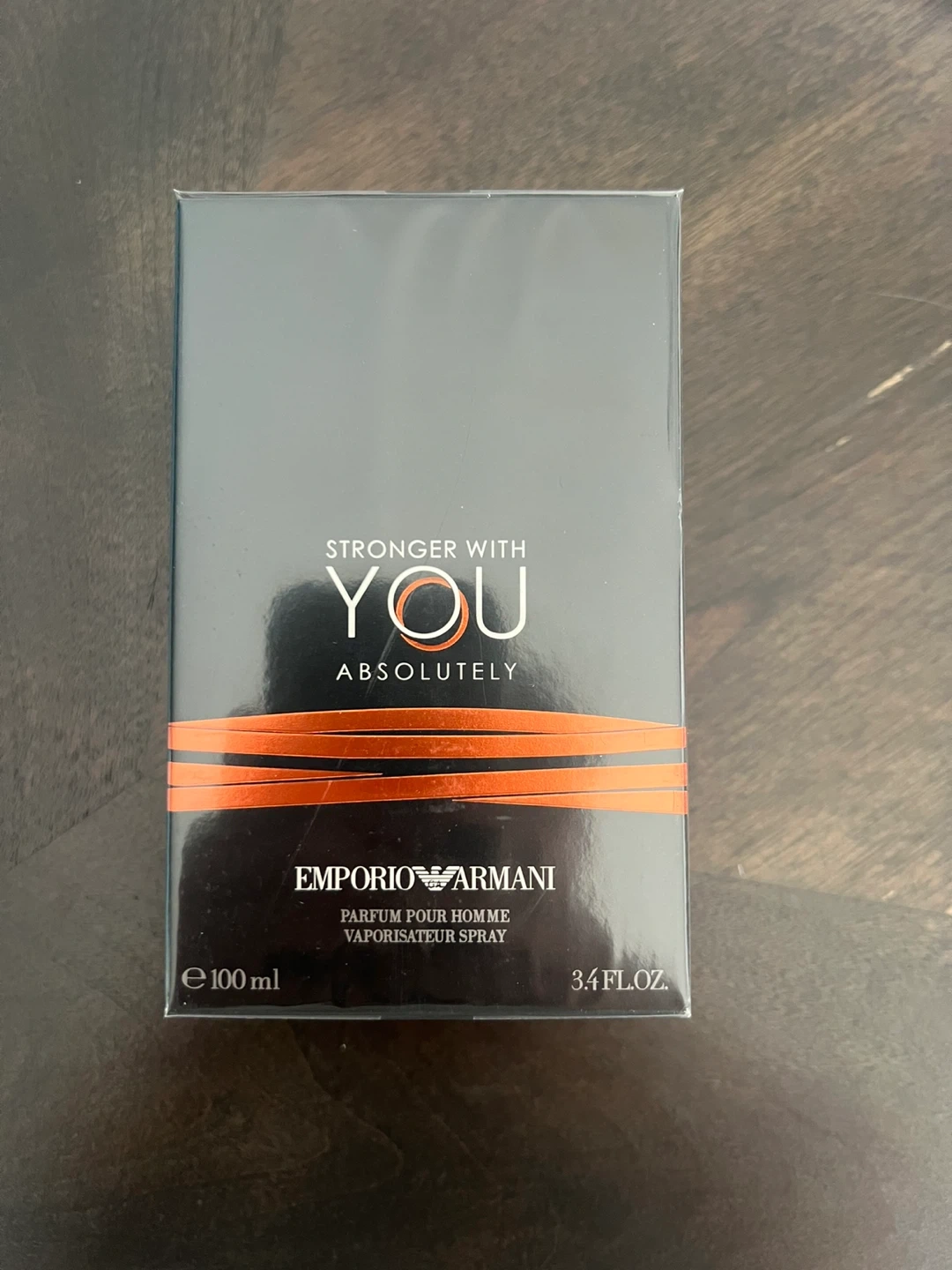 Emporio Armani Stronger With You Absolutely, a men's fragrance. This is a 100ml spray bottle. Ingredients include alcohol, parfum, and aqua.