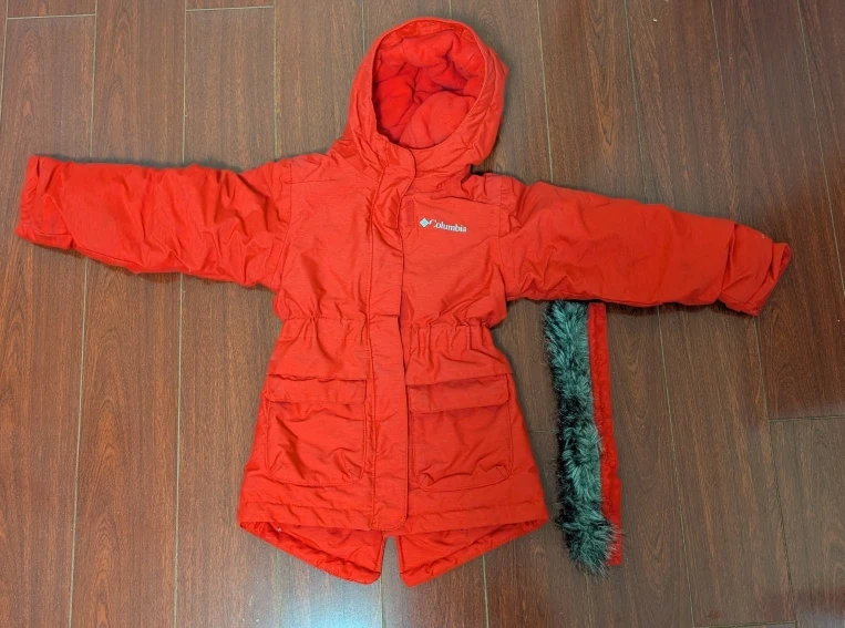 This is a red Columbia winter jacket, perfect for keeping your little one warm during the cold months! It has a hood and a faux fur trim. You can detach the faux fur.