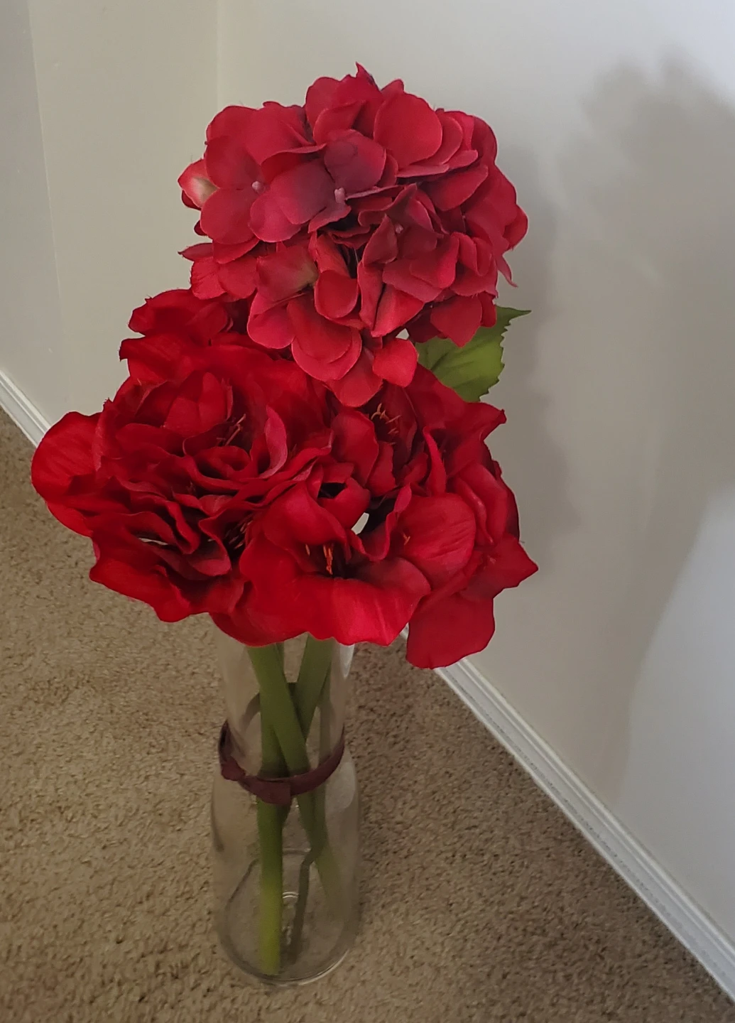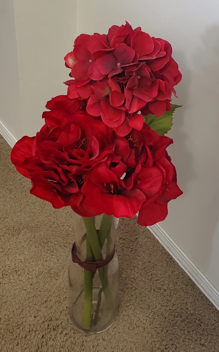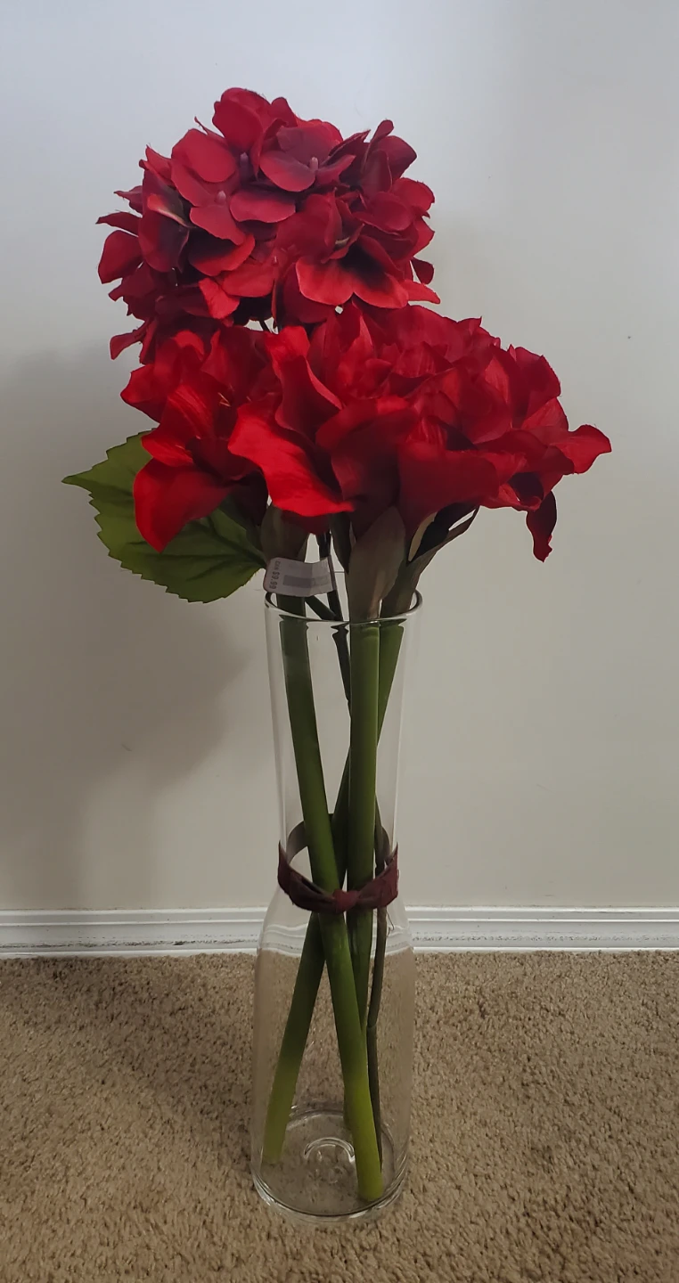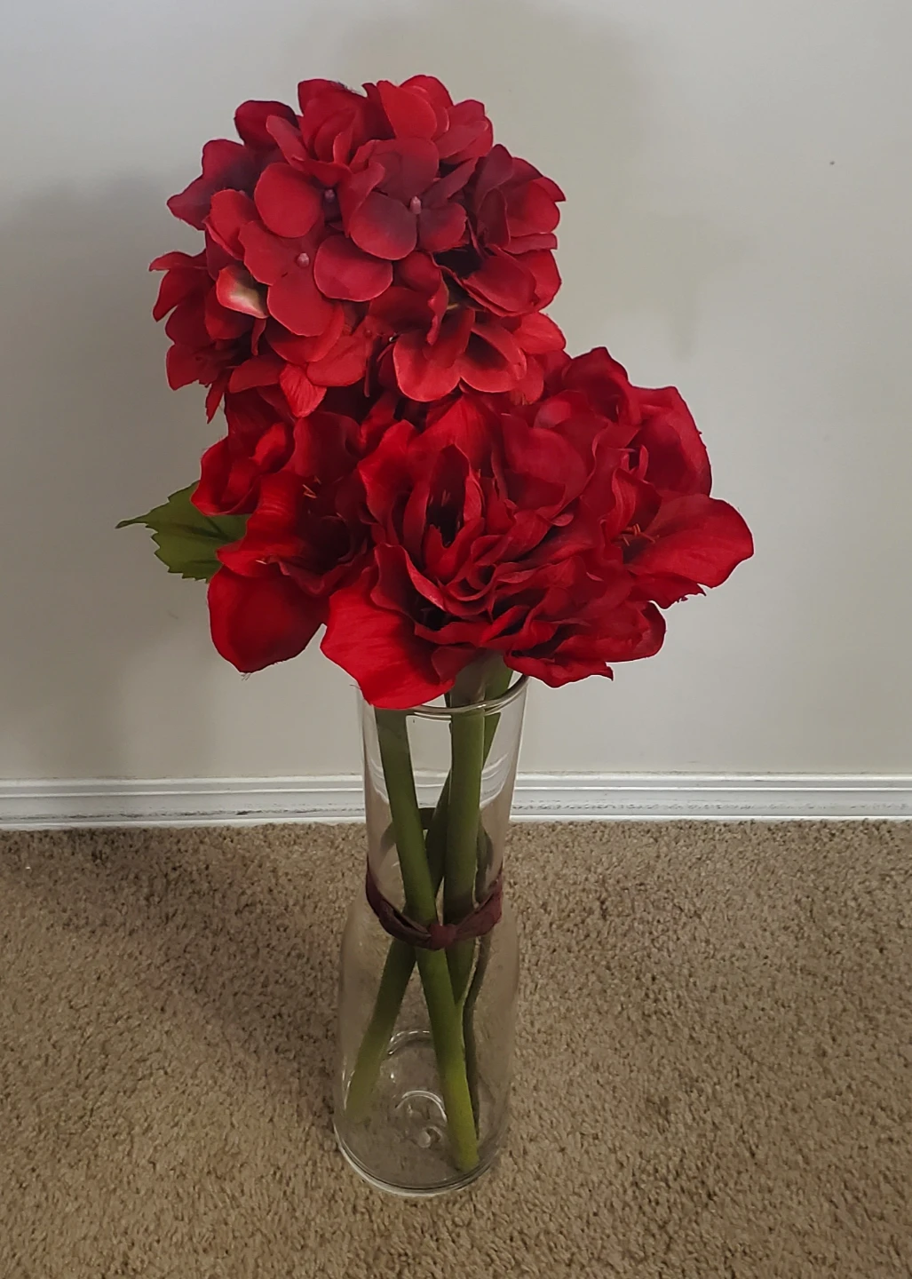 Set of red artificial flowers, including hydrangea and amaryllis blooms, presented in a clear glass vase. Stems are bound with a burgundy ribbon. These faux flowers add a pop of colour to any room.