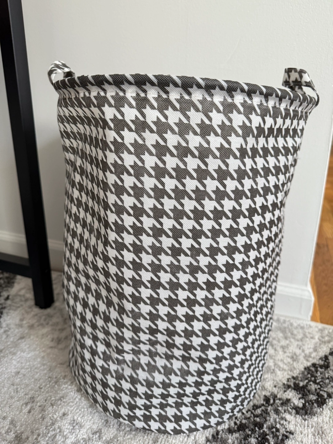 This houndstooth storage bin is perfect for organizing your space. It's a stylish and practical way to keep things tidy. The black and white pattern adds a touch of elegance to any room. Great for storing toys, laundry, or other household items