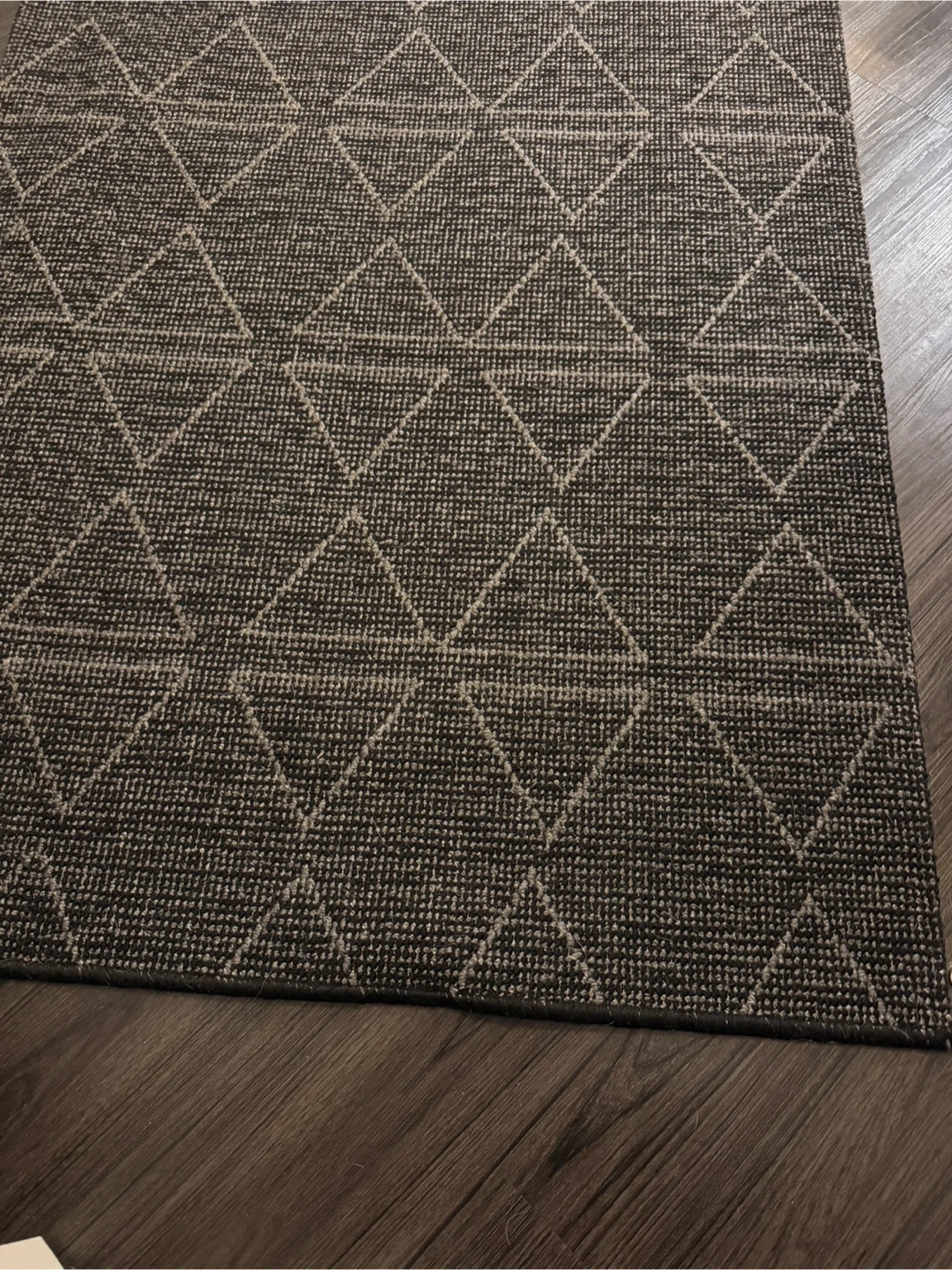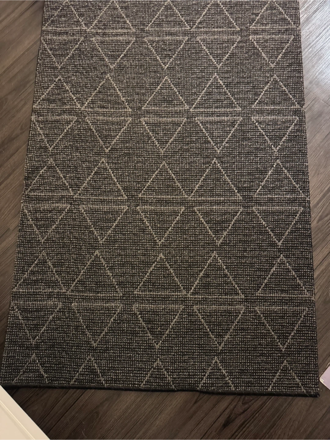A black/ dark grey & white runner rug featuring a repeating geometric diamond pattern. It's made from a durable, textured material suitable for high-traffic areas. Adds a modern touch to hallways or entryways.