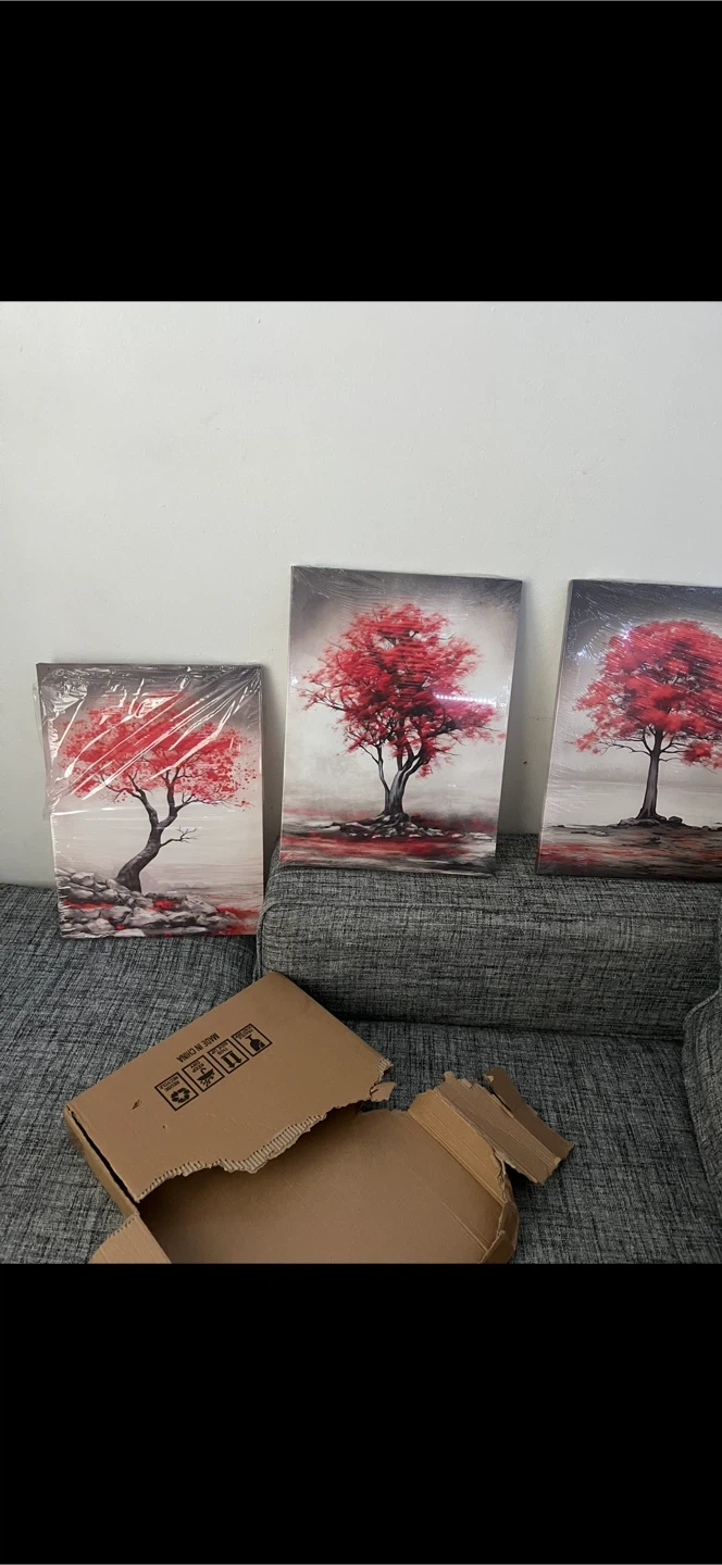 This is a set of three canvas prints featuring a red tree design. Each piece is wrapped in plastic. It's a nice addition to any living space!