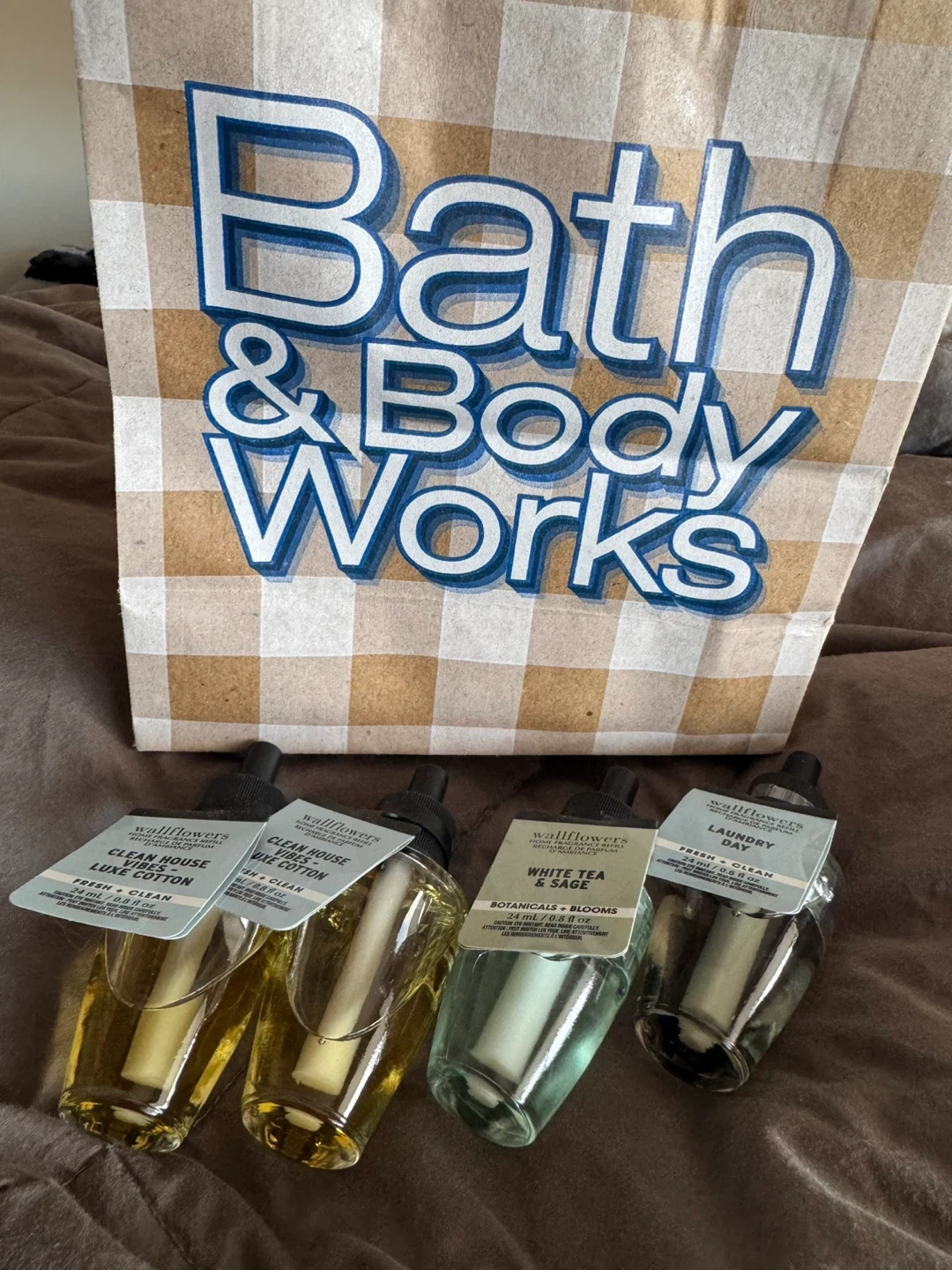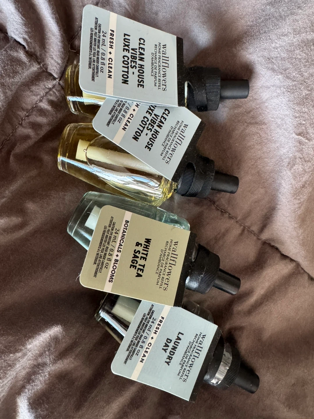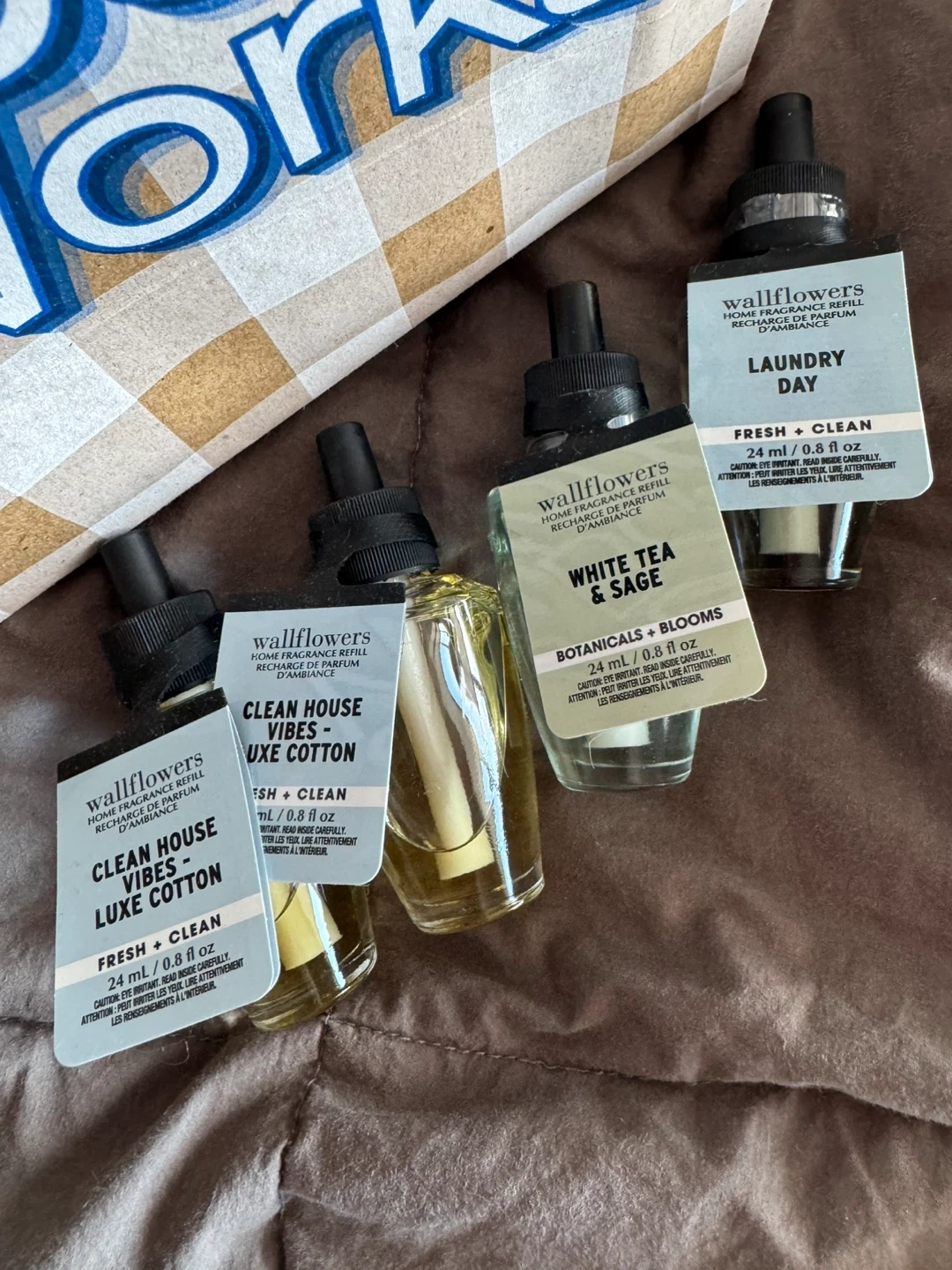 Four Bath & Body Works Wallflowers home fragrance refills are included. Scents are Clean House Vibes - Luxe Cotton (x2), White Tea & Sage, and Laundry Day. Each refill is 24 ml / 0.8 fl oz.
