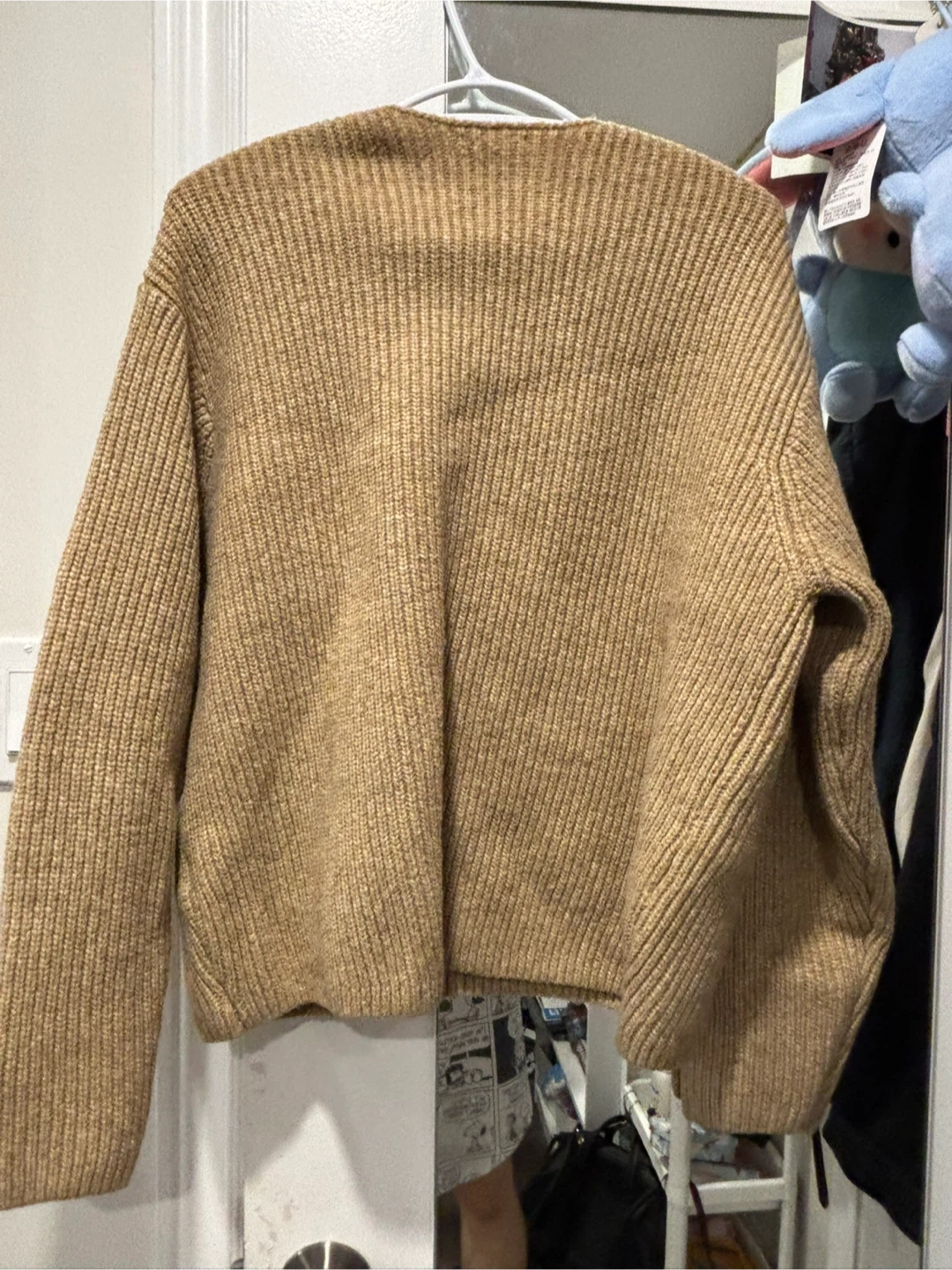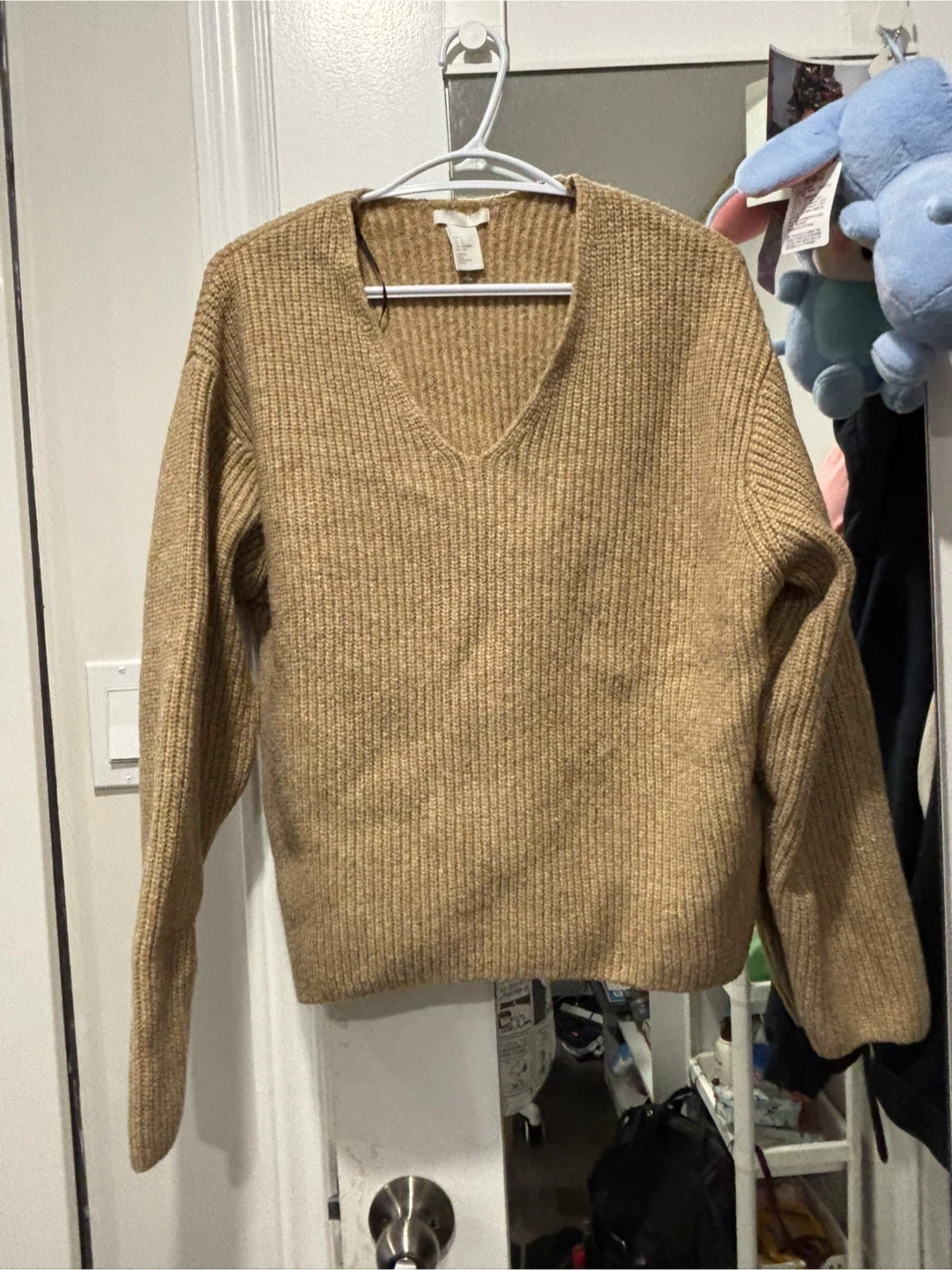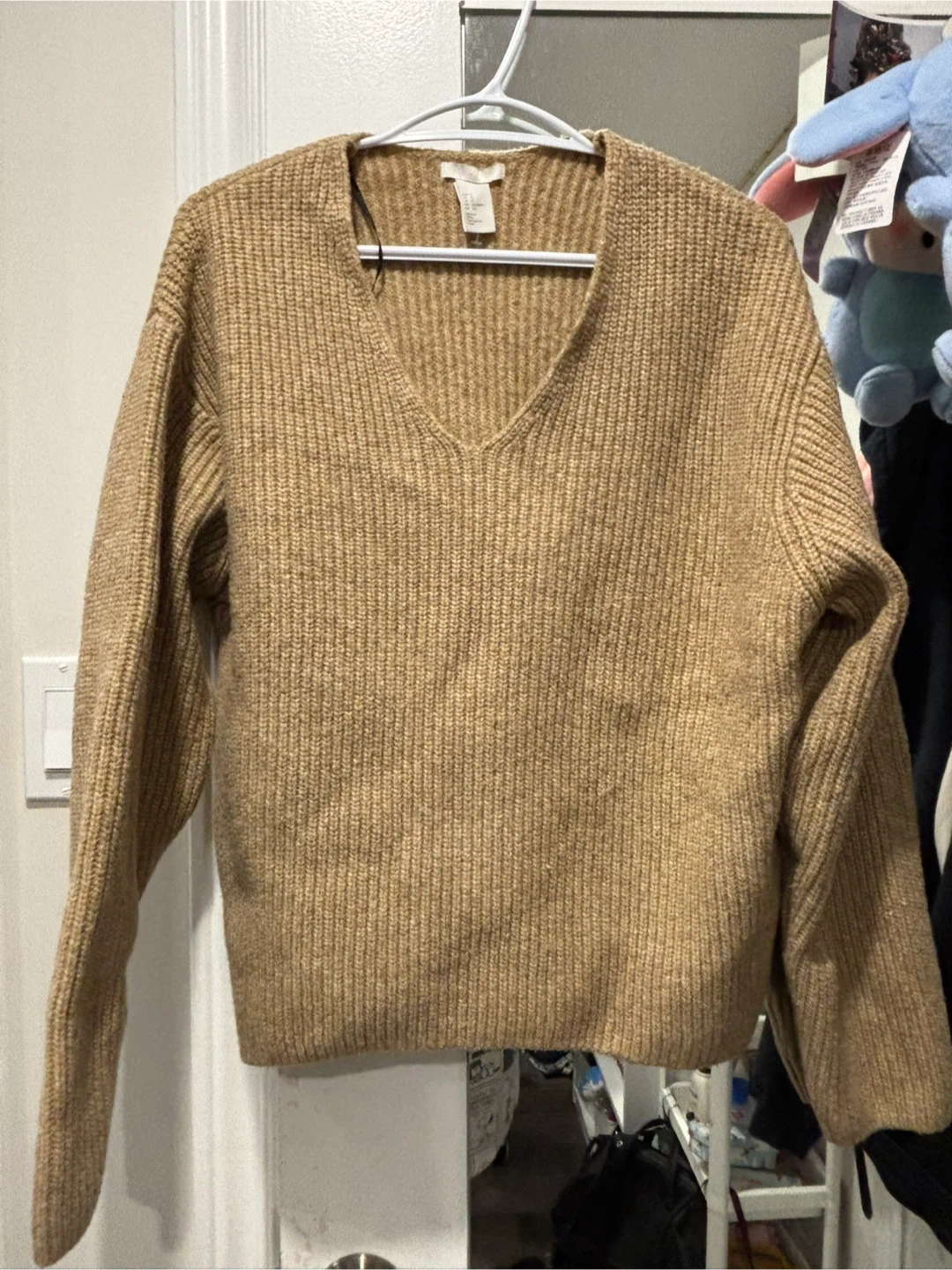 A cozy beige knit sweater from H&M! This V-neck is perfect for layering or wearing on its own. It's in great condition and ready for a new home. Feel free to reach out if you have any questions!