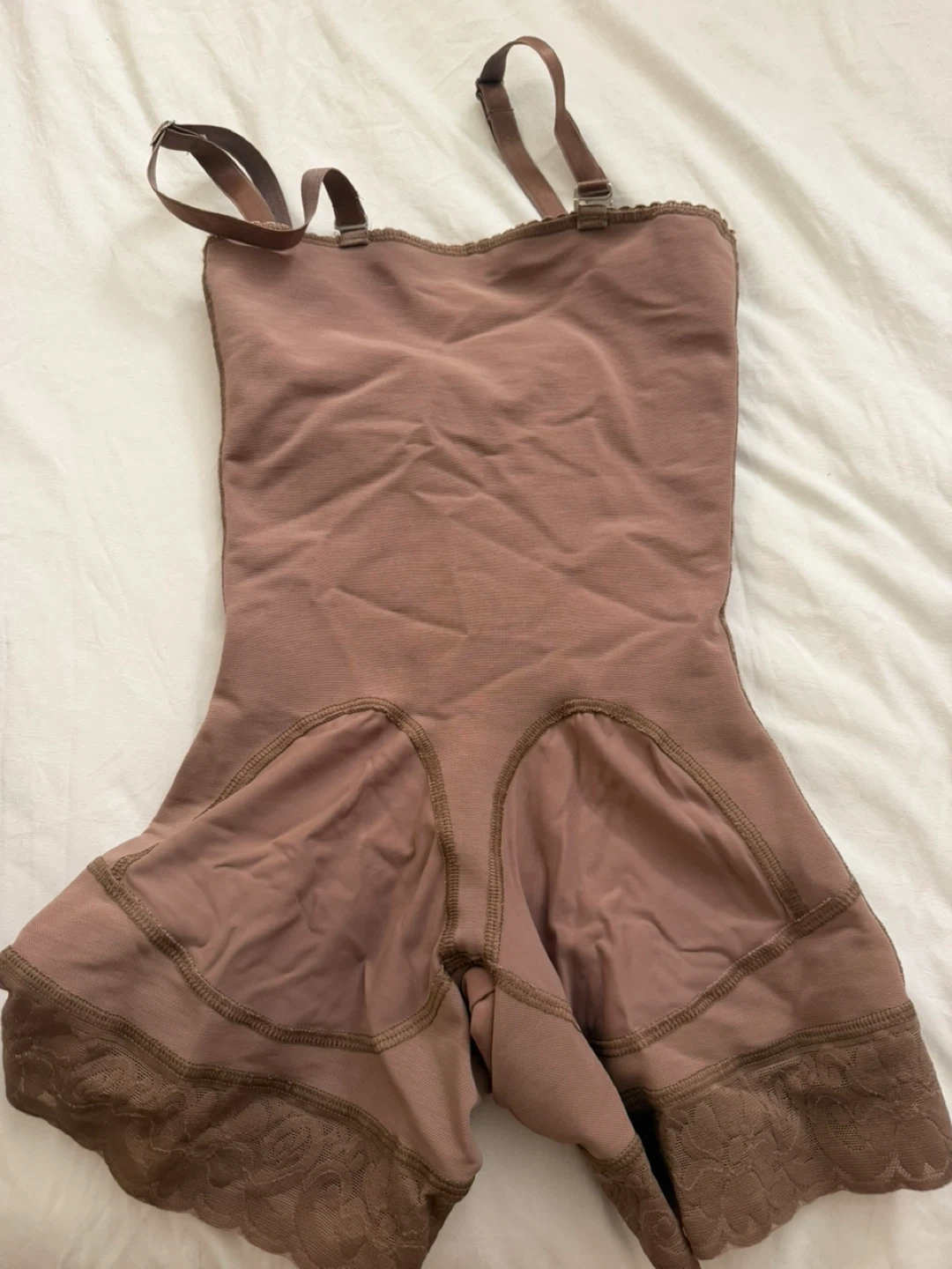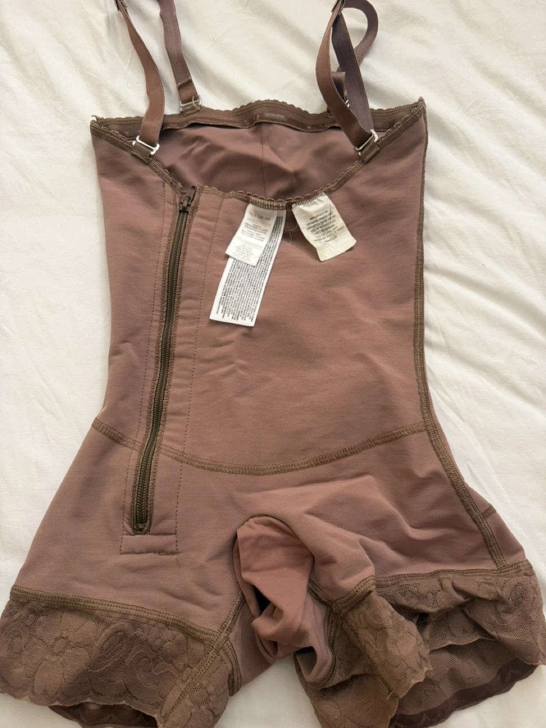 This is a Spanx Power Short shapewear garment. It's a size 2 Xsmall and made from a nylon and spandex blend. The color is a light brown or taupe with lace trim at the leg openings. It features adjustable straps and a side zipper closure.