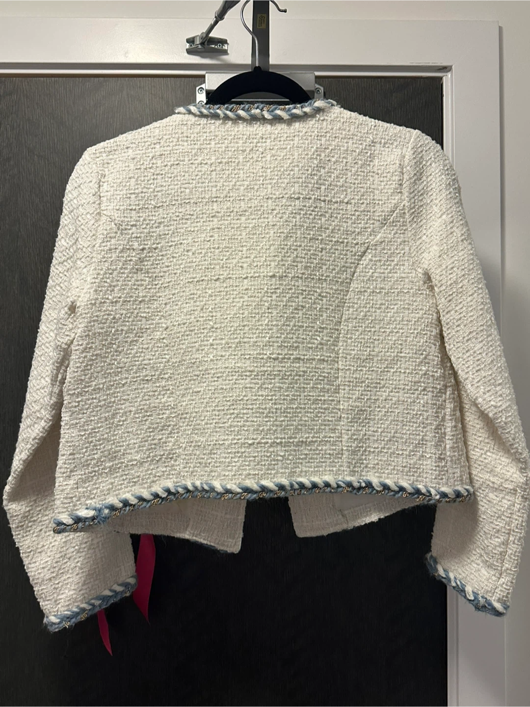 Here's a beautiful cream-coloured tweed jacket. It has a classic and stylish design with a soft, textured feel. Perfect for adding a touch of elegance to any outfit!
