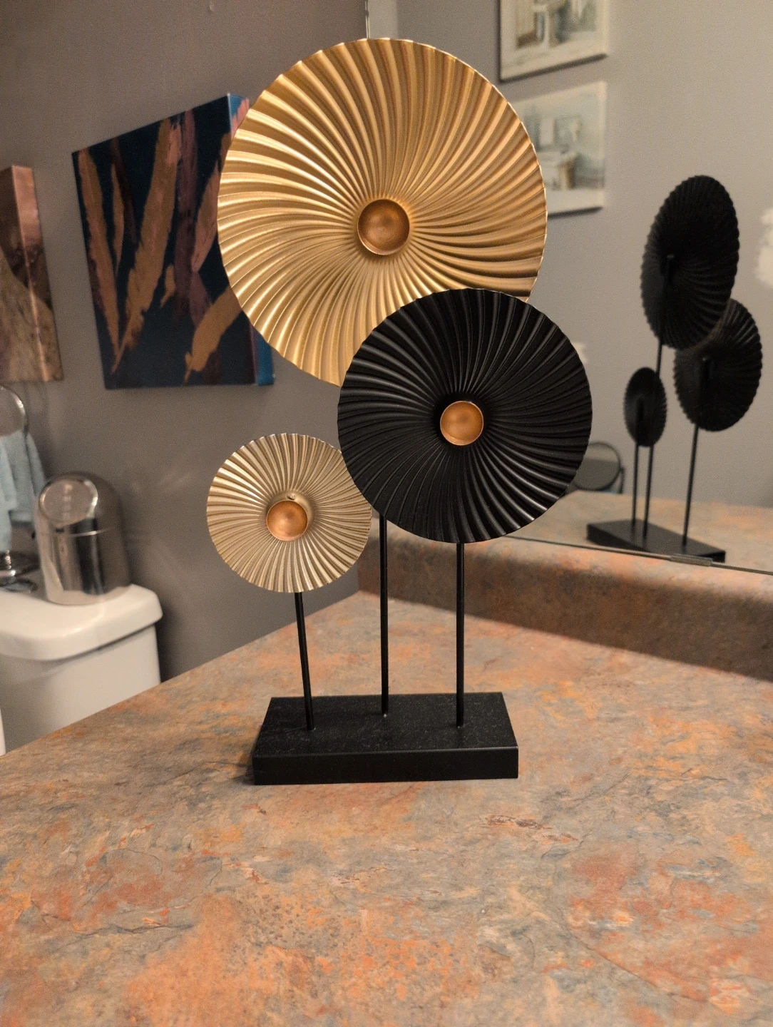Set of three decorative sculptures with a sunburst design. Features a gold-toned and two black sculptures on a black base. Adds a modern touch to any space.