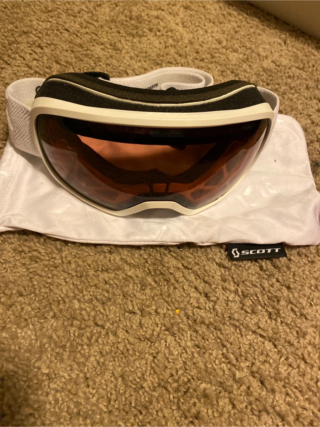 Scott ski goggles featuring a white frame and a rose-tinted lens. It comes with a protective pouch. These goggles are designed for snow sports. Brand new - bought but never got to use.