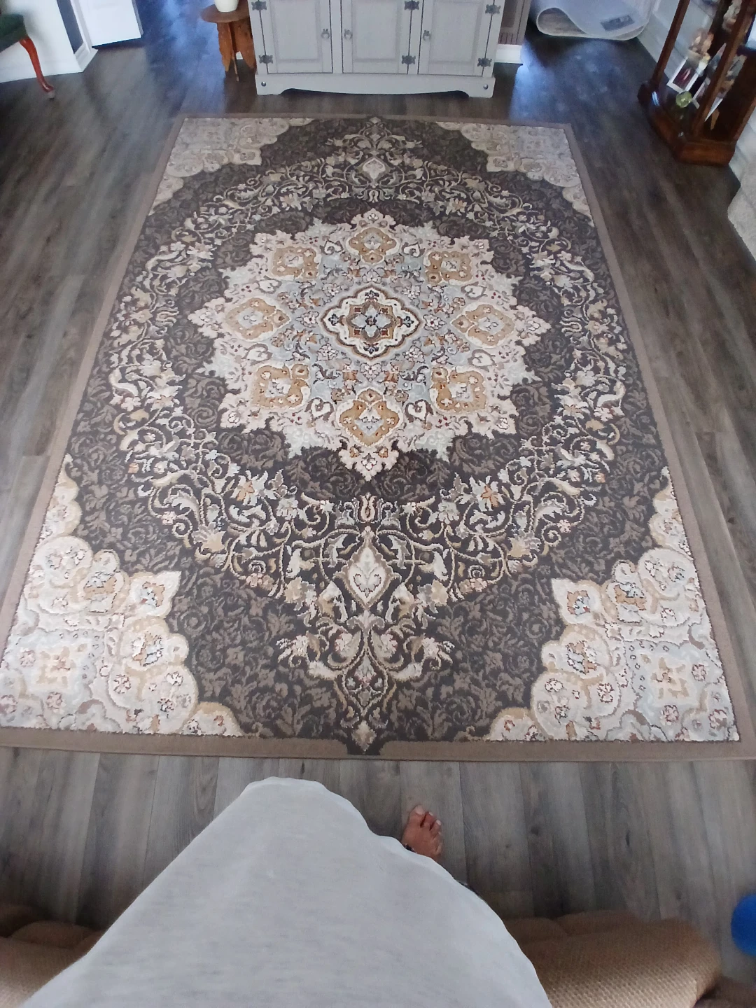 9'3"×6'6" .Beautiful area rug with a traditional Persian design. Features intricate patterns in shades of brown, cream, and blue. Adds a touch of elegance to any room.