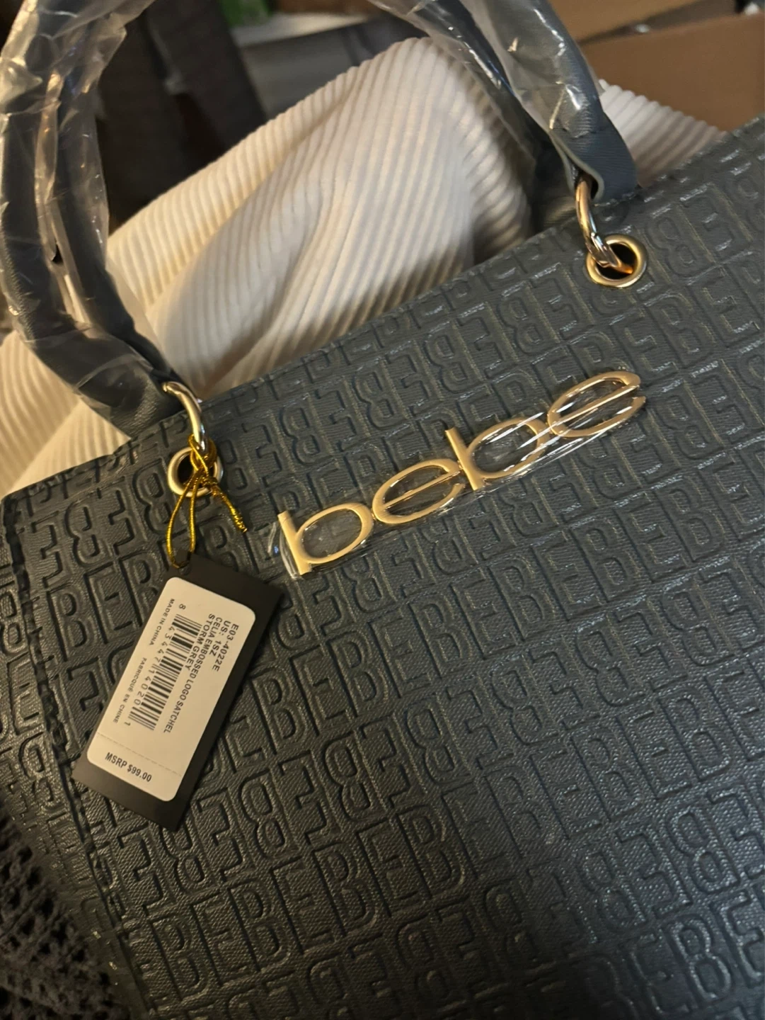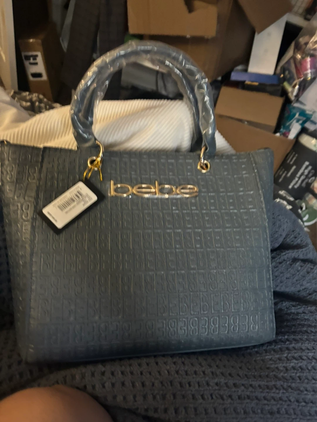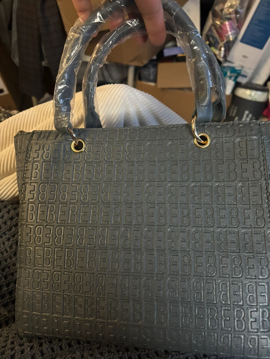 This is a grey tote handbag from Bebe. It features an all-over embossed logo pattern and gold-tone hardware. The top handles are wrapped in plastic. MSRP $99.00.