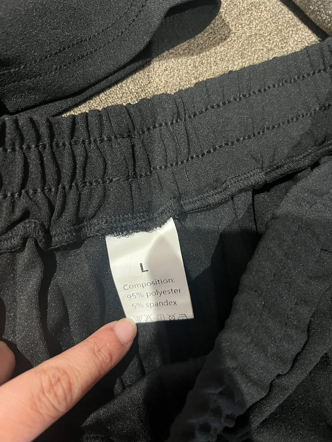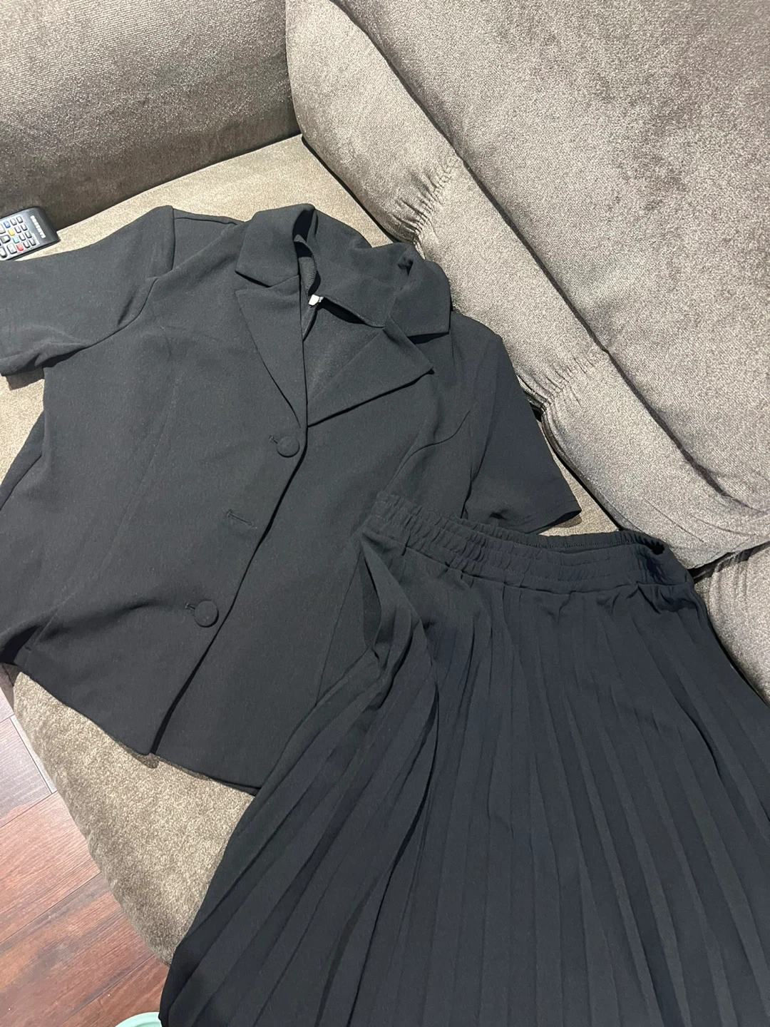 This is a size L black pleated skirt and a matching short-sleeved blazer. The skirt is made of 95% polyester and 5% spandex. It's a versatile set for many occasions!