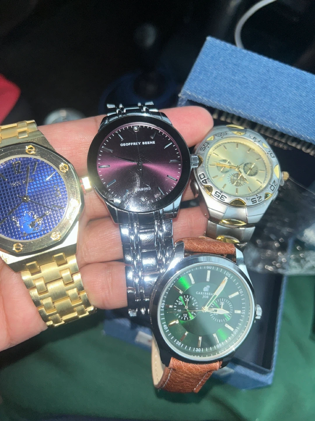 This lot includes four men's watches. One is a gold-tone watch with a blue textured dial. Another is a Geoffrey Beene watch with a purple dial and diamond accent. There's also a silver and gold-tone watch with a textured dial. Finally, a watch with a green dial and brown leather strap is included. These watches offer a variety of styles.