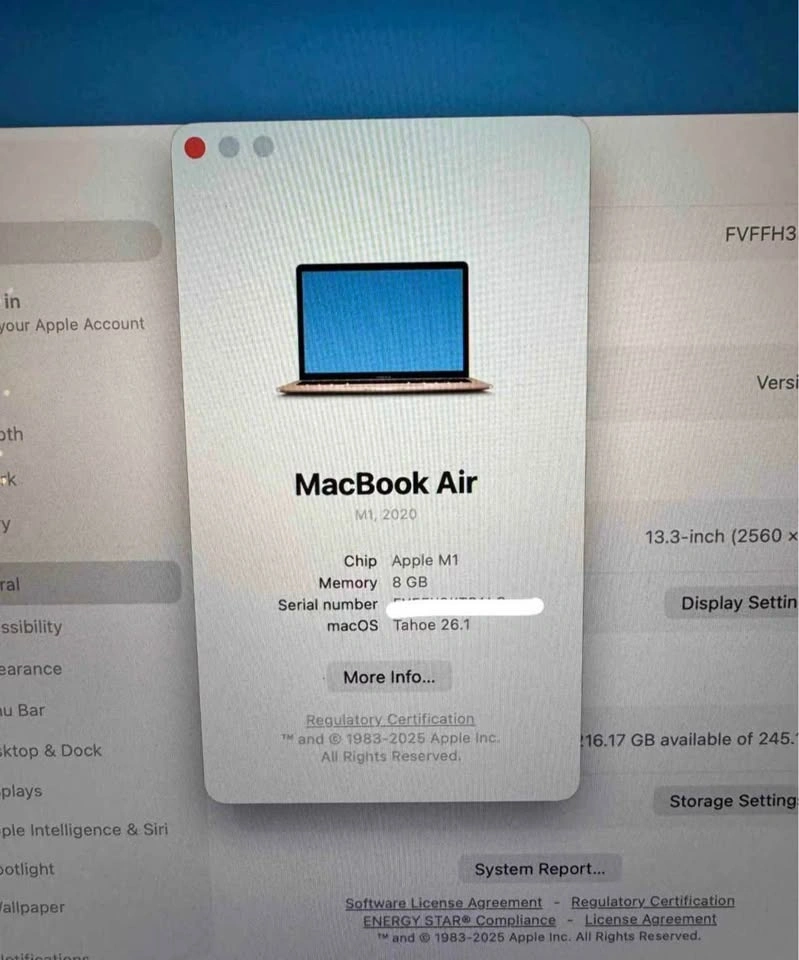 • Model: MacBook Air M1 2020, 13 inch (Model No# A2337)