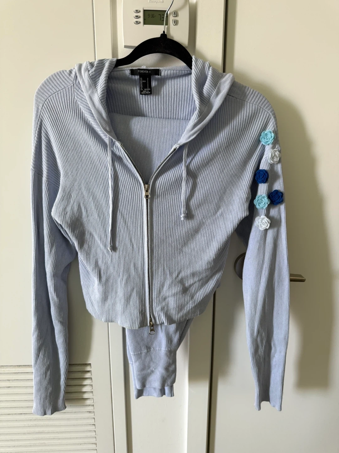 This Forever 21 hoodie is a light baby blue colour with a ribbed texture. It's a cropped zip-up style with a hood and features cute flower appliqués on the sleeve. Size is small.