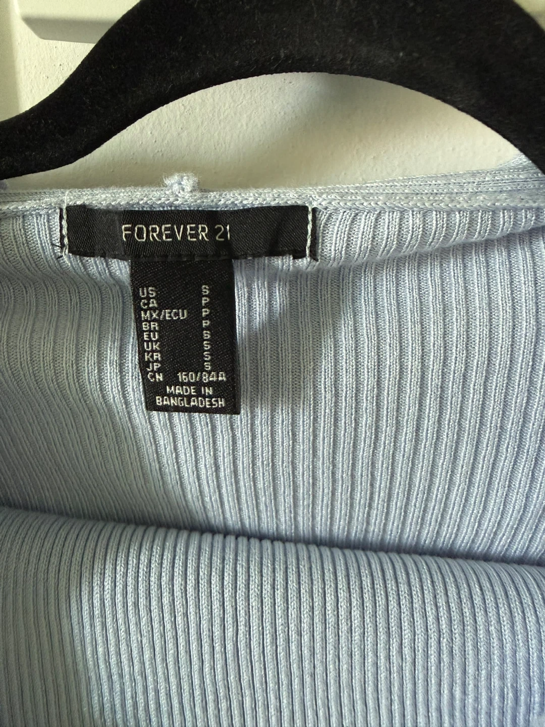 This Forever 21 hoodie is a light baby blue colour with a ribbed texture. It's a cropped zip-up style with a hood and features cute flower appliqués on the sleeve. Size is small.