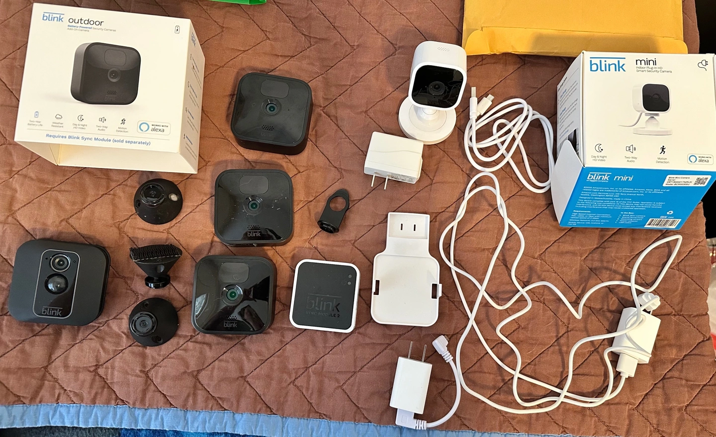 The price includes EVERYTHING: a blink mini indoor plug-in HD smart security camera, with original cord, long cord, and mounting plate with plug-in. Also included is one (1) 2nd generation outdoor wireless camera and three (3) 3rd generation outdoor wireless cameras with mounting hardware. All components are in working order. Everything in the photo will be sold together. I will not separate. If you do not want a component, feel free to make an offer for all and throw away what you do not want. Thank you!