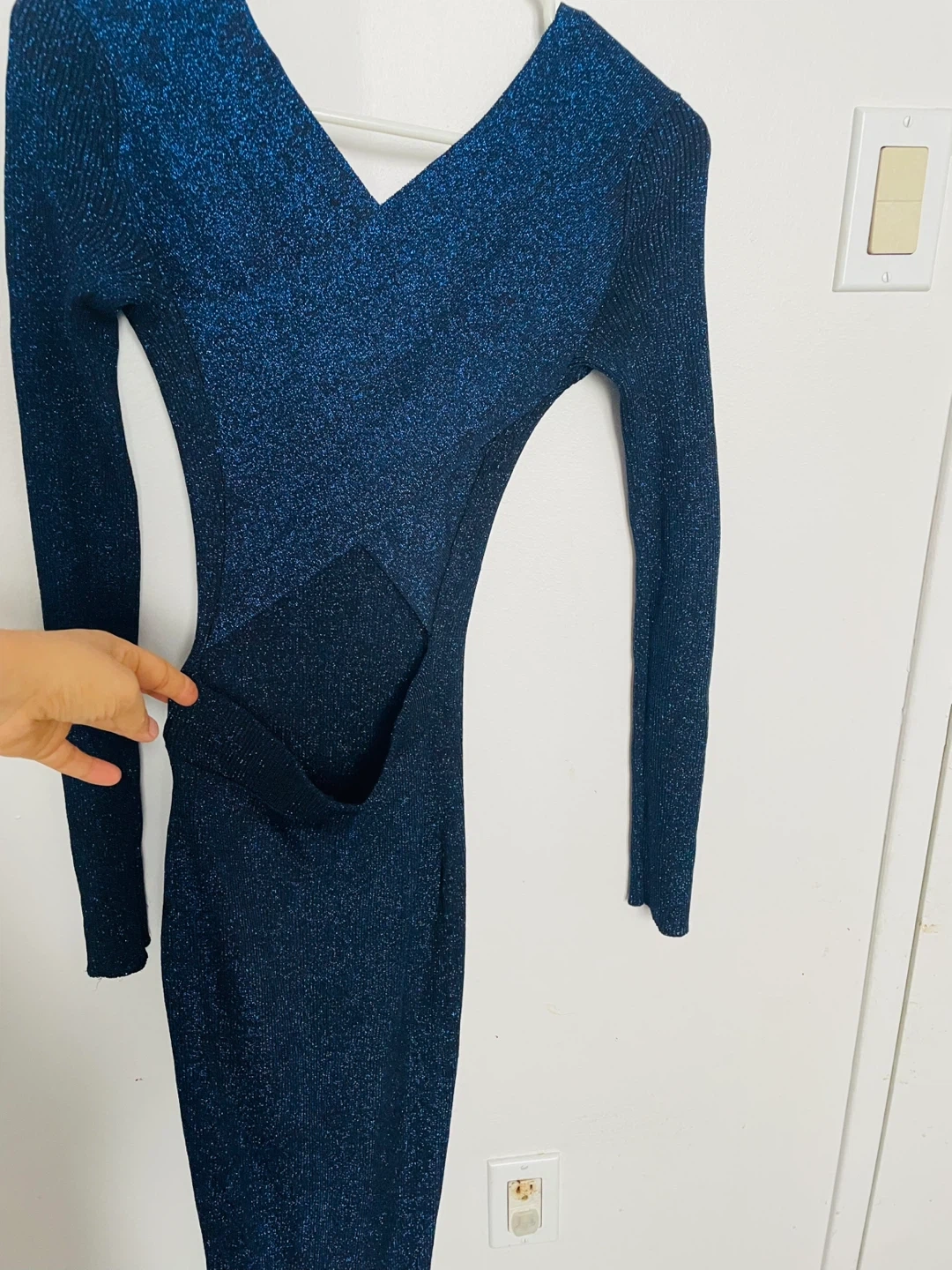This sparkly blue midi dress features long sleeves and a flattering V-neckline. It's made from a stretchy, ribbed knit fabric for a comfortable fit. The dress is perfect for a night out or a special occasion!