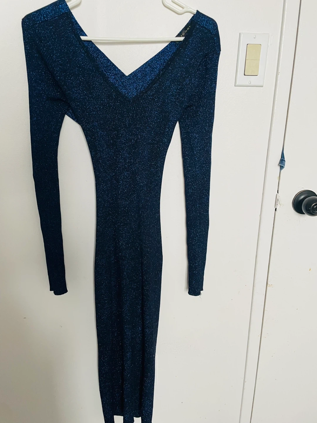 This sparkly blue midi dress features long sleeves and a flattering V-neckline. It's made from a stretchy, ribbed knit fabric for a comfortable fit. The dress is perfect for a night out or a special occasion!