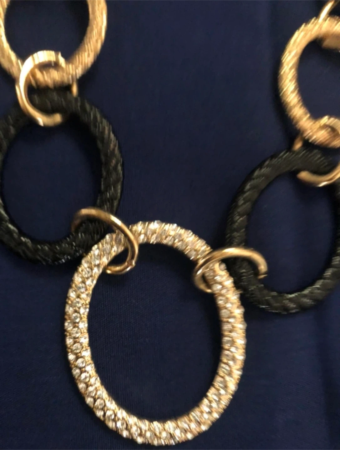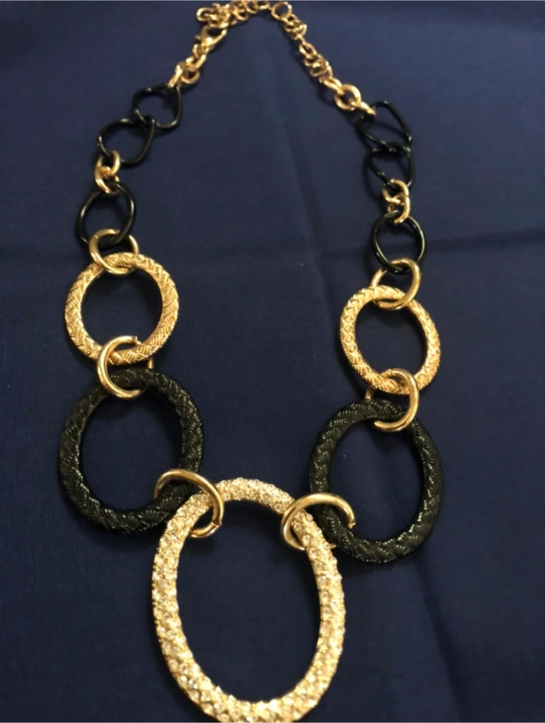 A stylish gold-tone necklace featuring a mix of black and gold textured rings, with a large central oval ring encrusted with rhinestones. It's a statement piece that's sure to add flair to any outfit. The chain is gold-toned with black oval links interspersed.