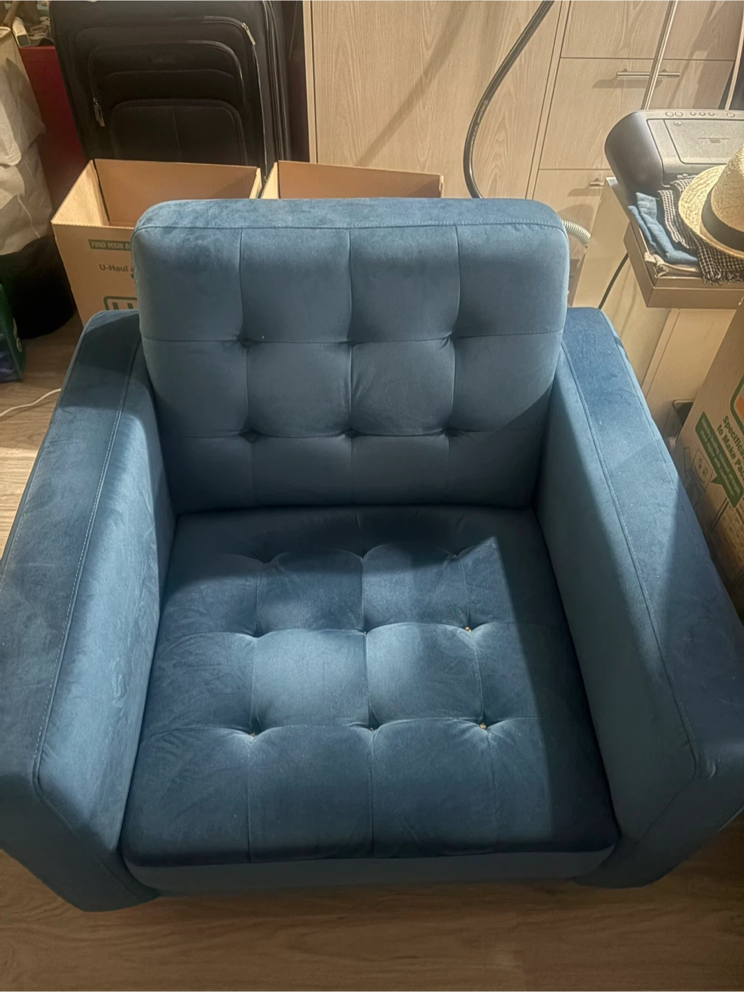 Comfortable blue accent chair with tufted cushions. Upholstered in soft fabric. Perfect for adding a stylish seating option to any room! We havent really used it much. You can see it is in good condition!