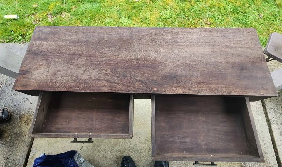 In good condition. Evaluated to be mango wood with a dark stain that complements the industrial black metal legs. A unique piece that will certainly stand out! Please note: it's heavy so bring help!