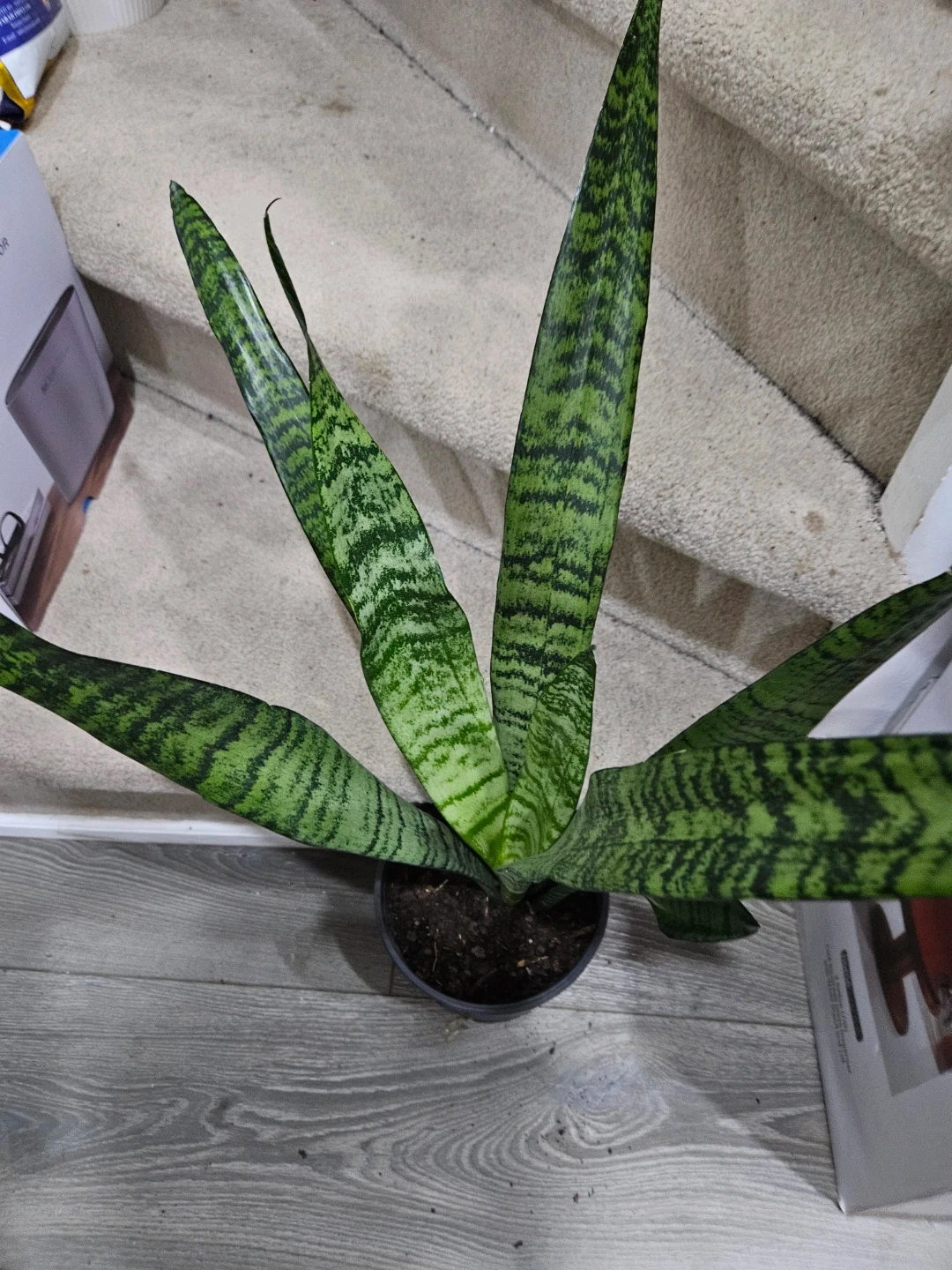Healthy snake plant in a black pot. Leaves are a vibrant green with dark stripes. This plant requires very little maintenance.