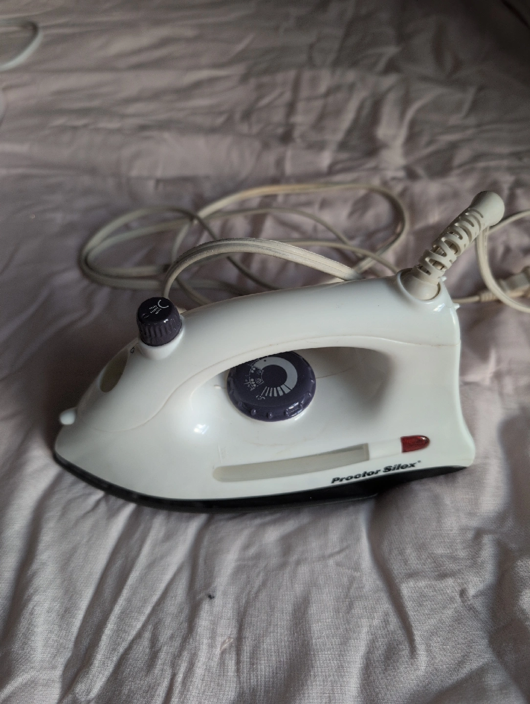 Giving away a Proctor Silex iron. It's in used condition and has some visible wear and tear on the plastic casing. Still works though!
