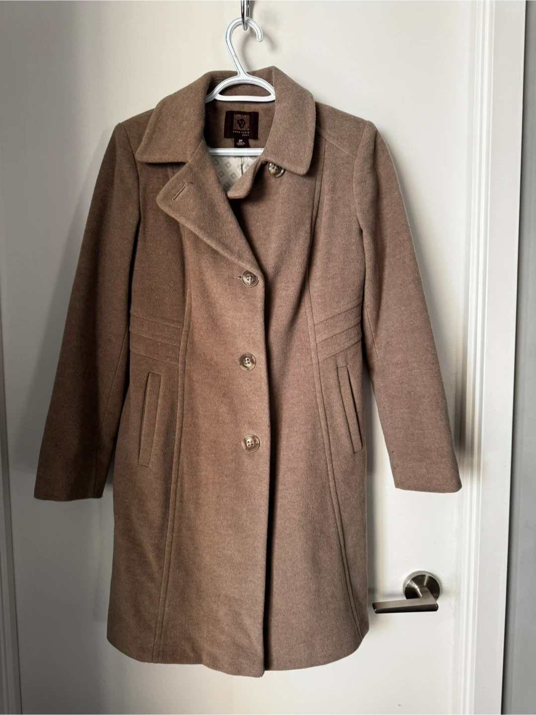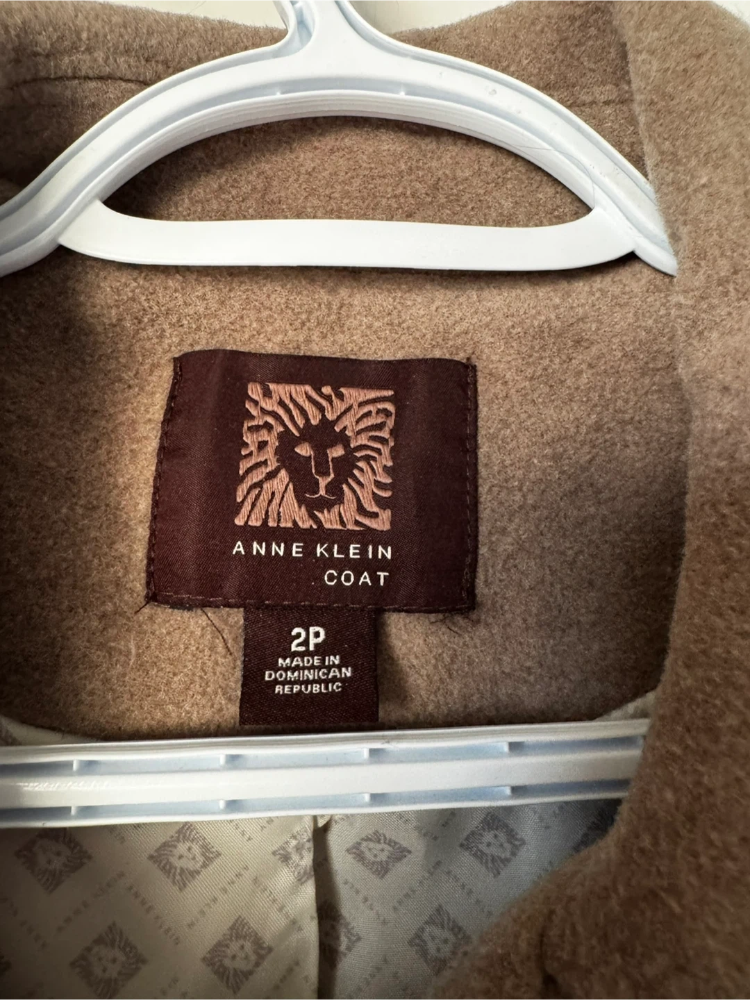 This is an Anne Klein coat in a classic tan colour. It's made in the Dominican Republic. Size 2P.