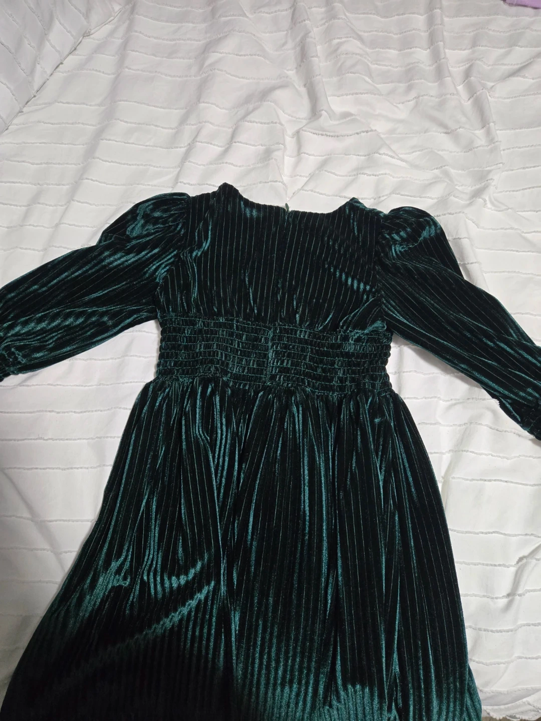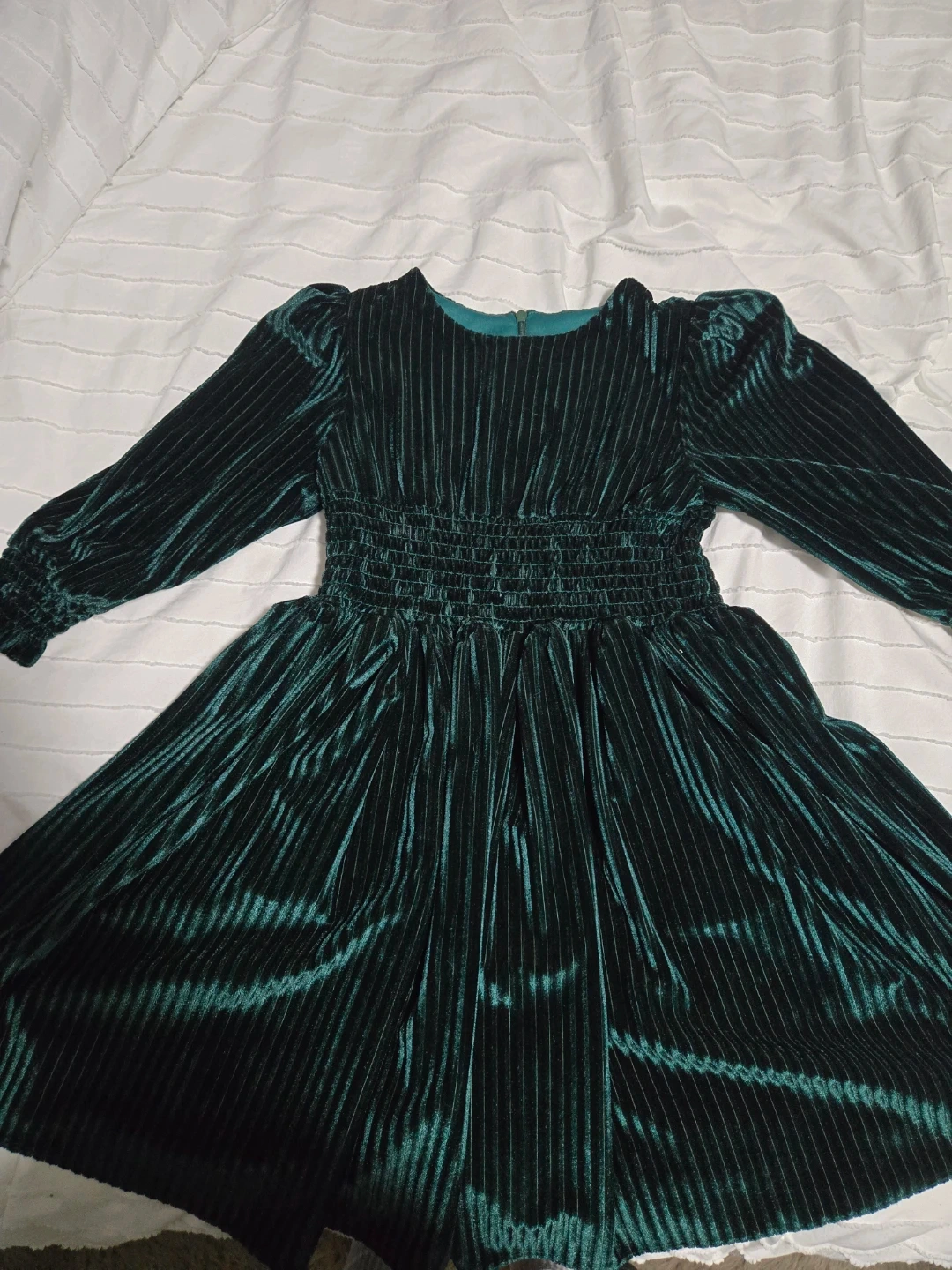 Emerald green velvet dress with long puff sleeves and a smocked waist. It's made from plush velvet fabric. This dress would be lovely for a holiday party or a special occasion!