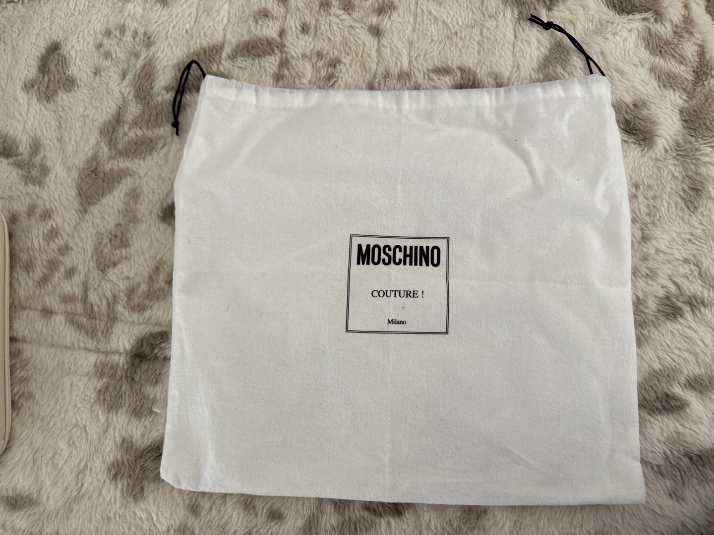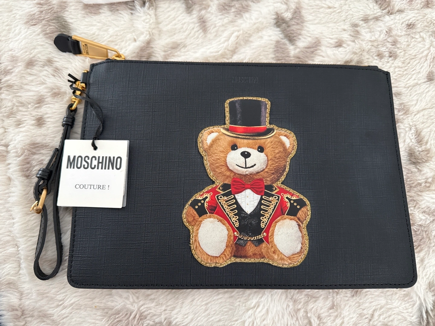 Brand new Moschino Couture! black leather clutch with a teddy bear design. The back features the Moschino logo in red with gold studs. Comes with a dust bag. It was $675 before all taxes. Now only $370.