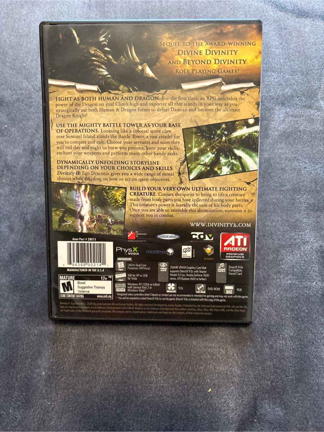 Divinity II: Ego Draconis for PC. Includes the game disc and manual. It's a role-playing game developed by Larian Studios. Requires Windows Vista or XP.