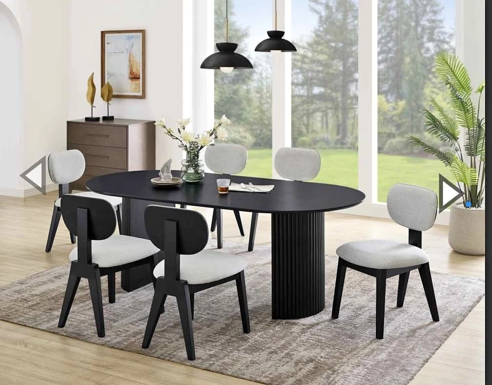 This 7-Piece Dining Set features a modern design and rich midnight black finish. It includes a sleek table and six matching chairs. The table has a contemporary knife-edge tabletop paired with a bold vertical grooved base. The chairs are upholstered with 100% polyester fabric. Built from premium rubberwood and oak veneer, this dining set combines sturdiness with a chic aesthetic. Perfect for intimate dinners or gatherings, the Dining Set seamlessly blends functionality with timeless design.