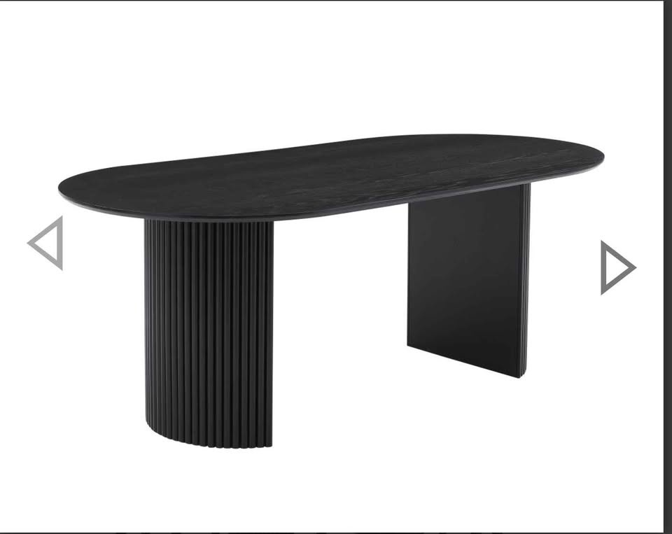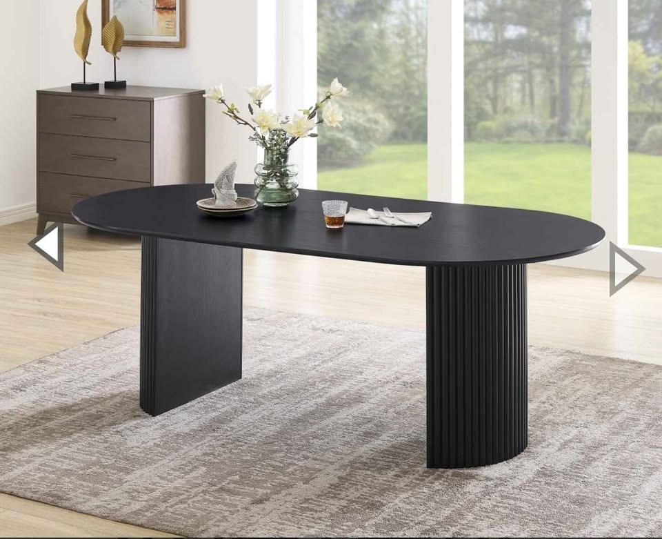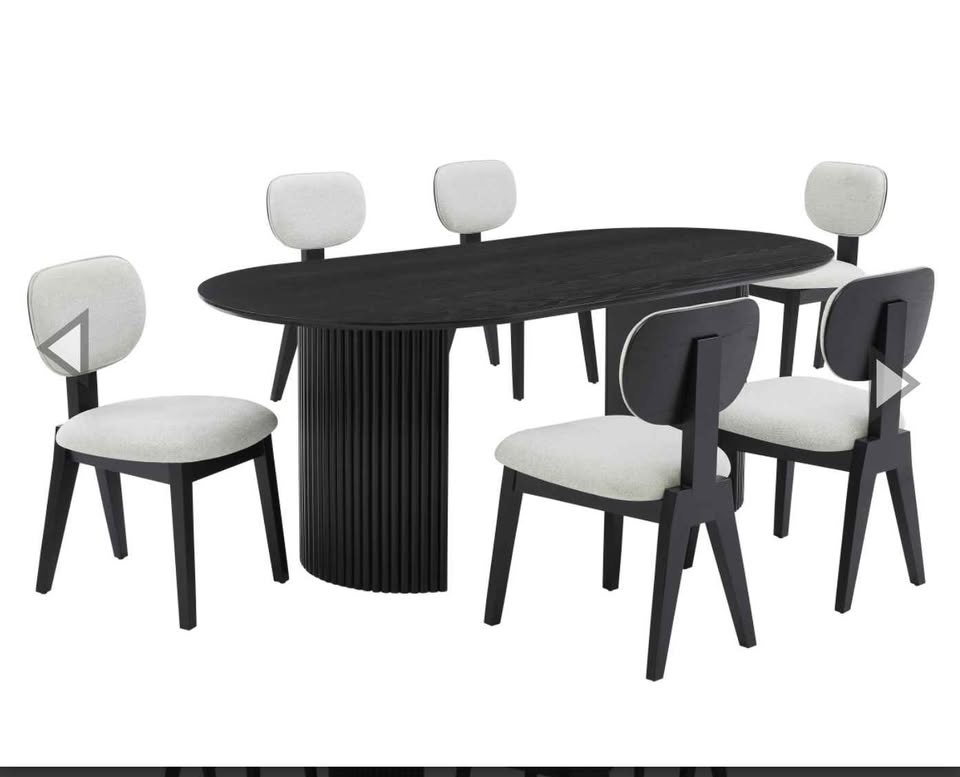 This 7-Piece Dining Set features a modern design and rich midnight black finish. It includes a sleek table and six matching chairs. The table has a contemporary knife-edge tabletop paired with a bold vertical grooved base. The chairs are upholstered with 100% polyester fabric. Built from premium rubberwood and oak veneer, this dining set combines sturdiness with a chic aesthetic. Perfect for intimate dinners or gatherings, the Dining Set seamlessly blends functionality with timeless design.