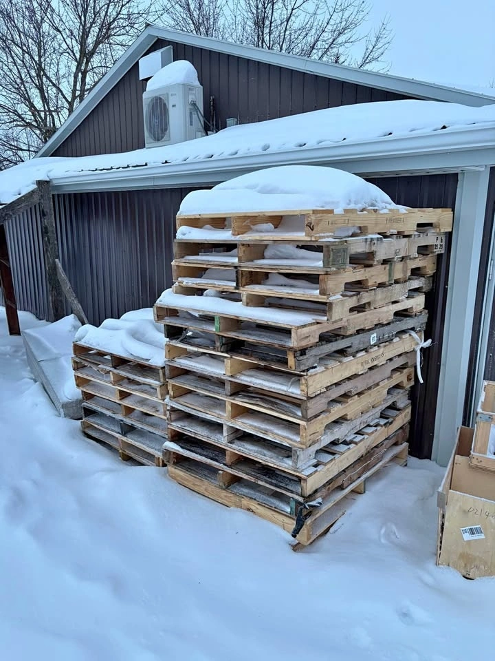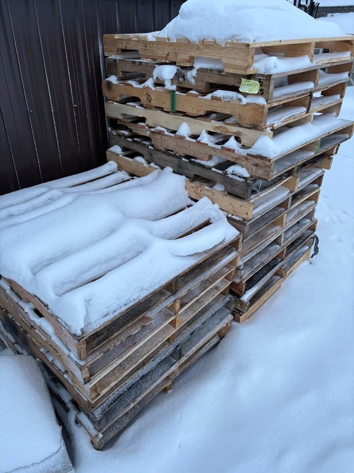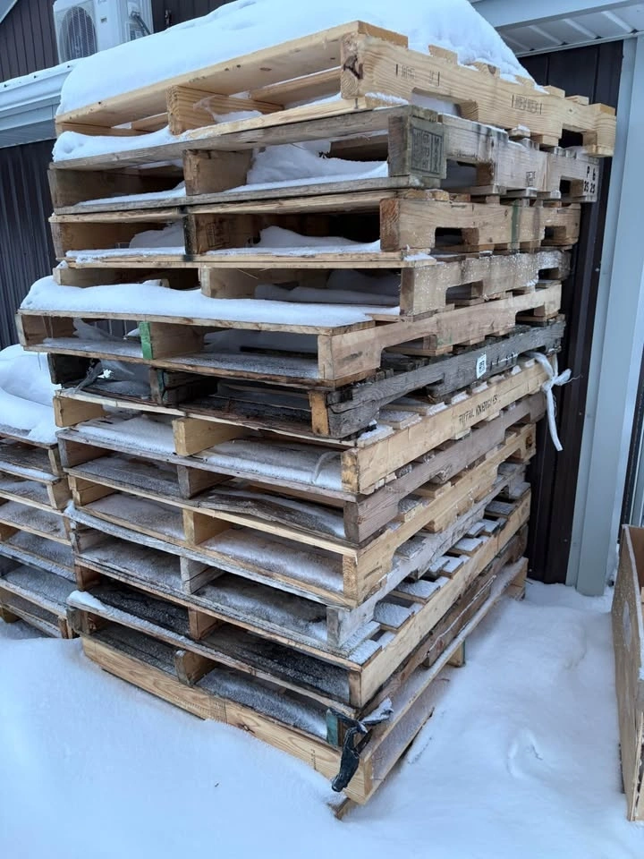 22 standard 48x40 wood pallets / skids available. All stringer style, solid and stackable. Mixed used condition but overall good — no major rot, still fully usable for shipping, storage, or projects. Pick up only.