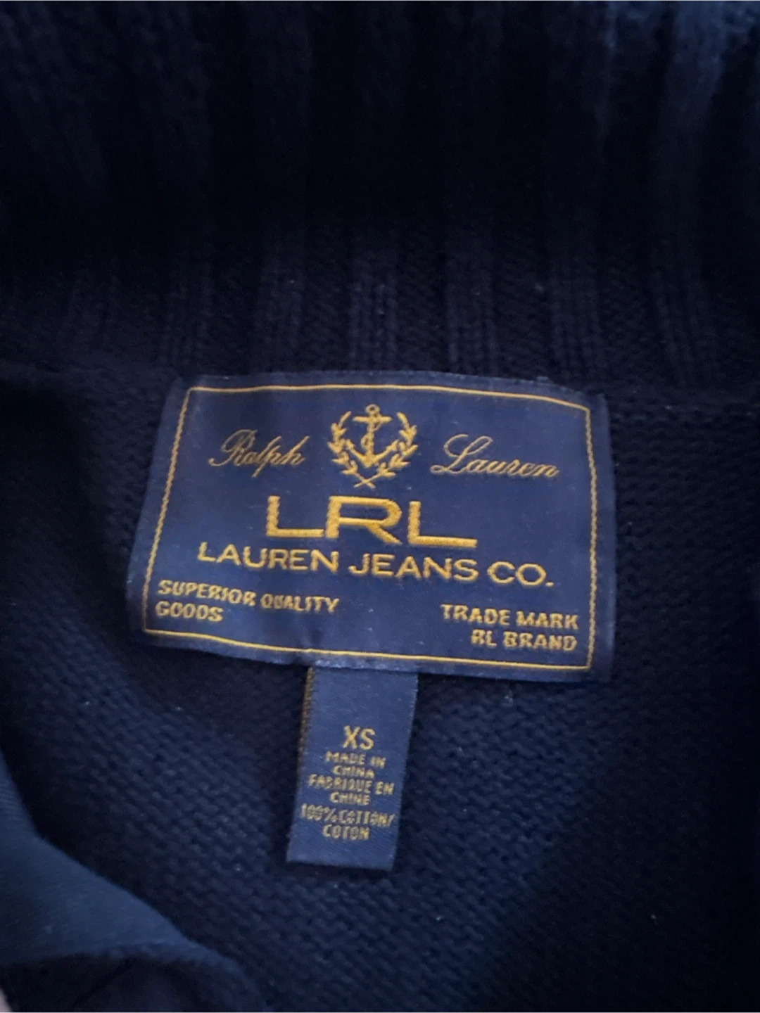 Navy Ralph Lauren sweater with a shawl collar and quarter-zip closure. It's made of 100% cotton. This sweater is size extra small.