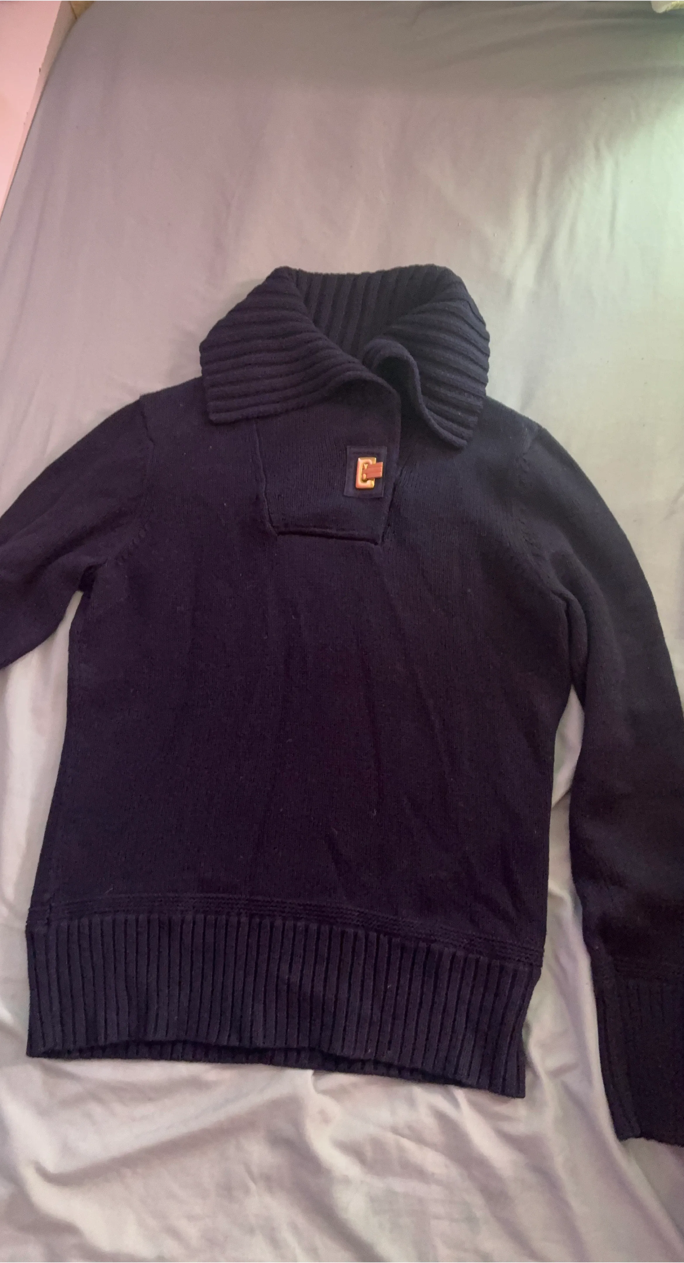 Navy Ralph Lauren sweater with a shawl collar and quarter-zip closure. It's made of 100% cotton. This sweater is size extra small.