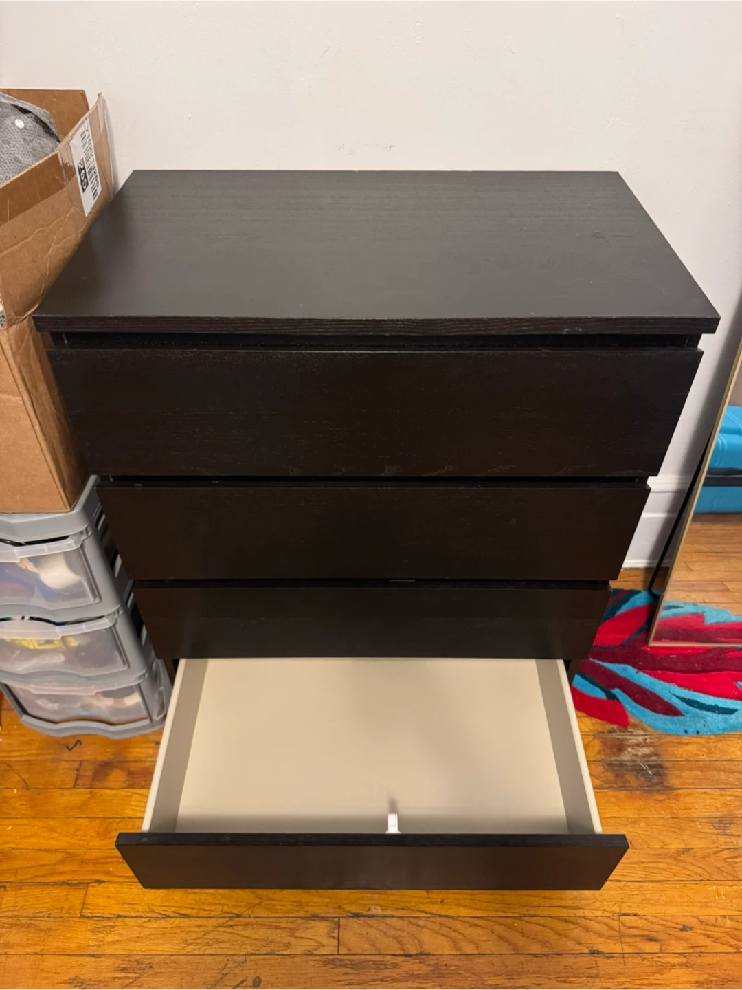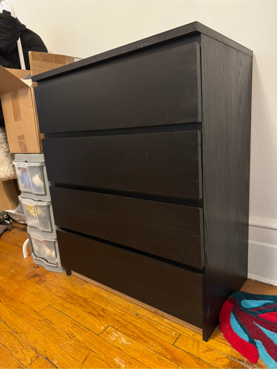 Selling a black dresser with 4 drawers. It's in good condition and perfect for adding storage to any room. The drawers slide smoothly. It's a sturdy and reliable piece of furniture