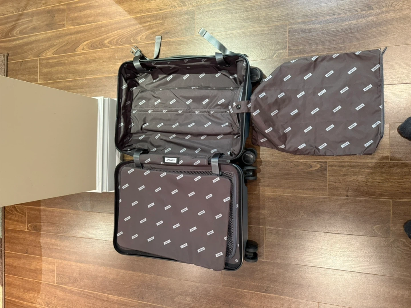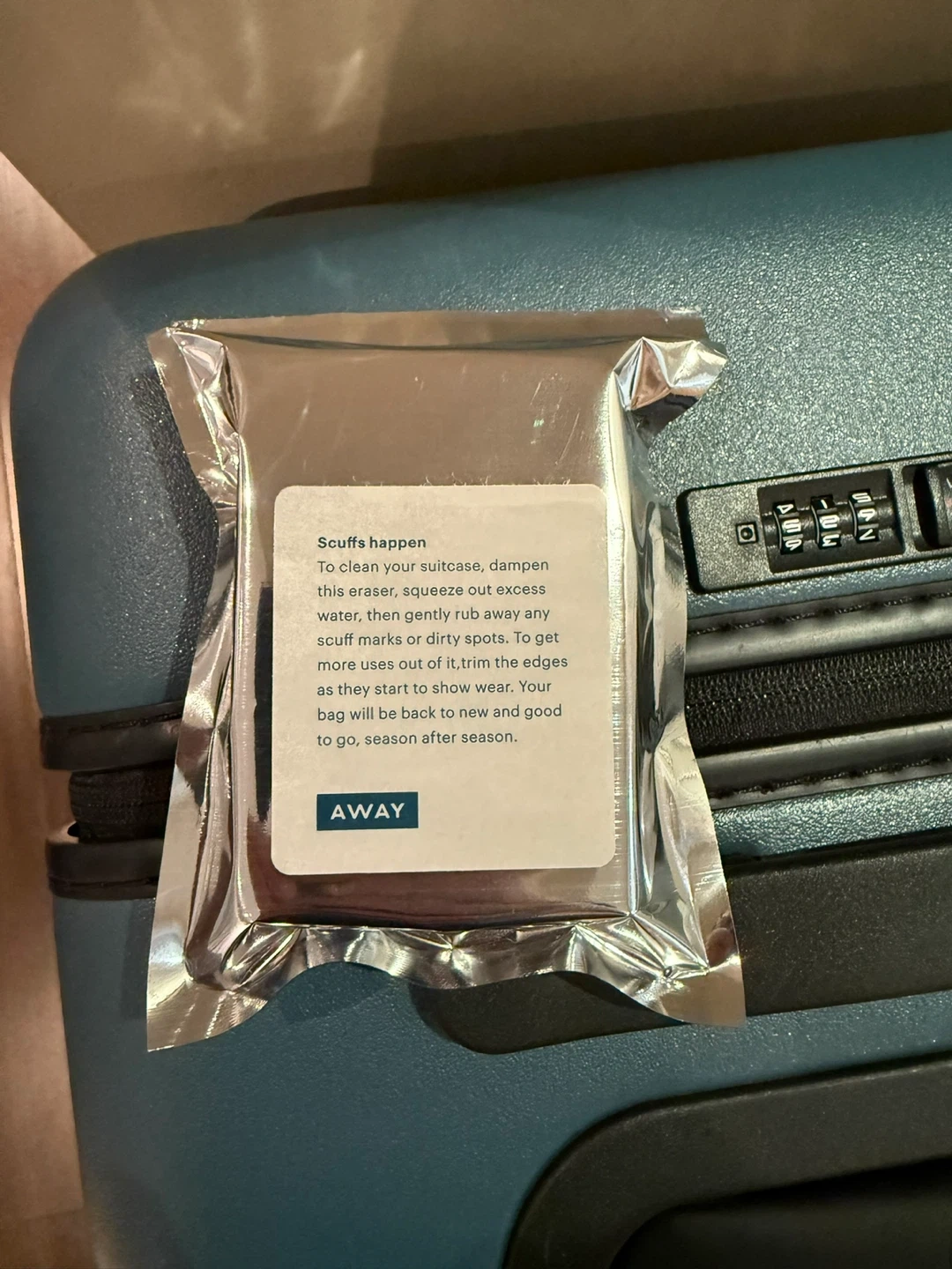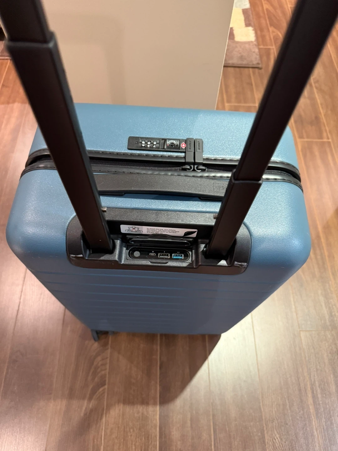 This is an Away carry-on suitcase in a nice blue colour. It features an interior compression system to help pack more. It also has a built-in TSA-approved lock for security. This suitcase is perfect for weekend trips or as a carry-on for longer journeys!