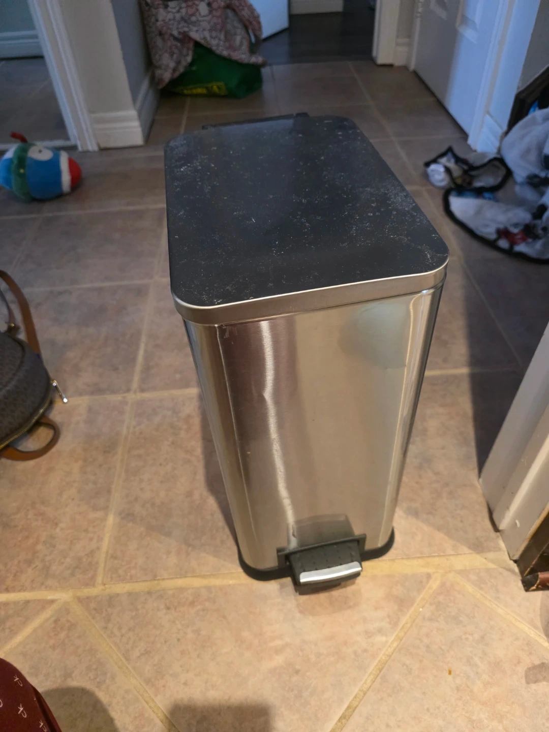 Rectangular stainless steel trash bin with a foot pedal for hands-free operation. It's a 10-gallon capacity can. Ideal for a kitchen or office space.Stainless Steel Step Can Trash Bin