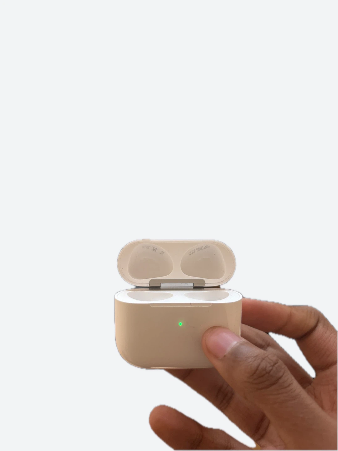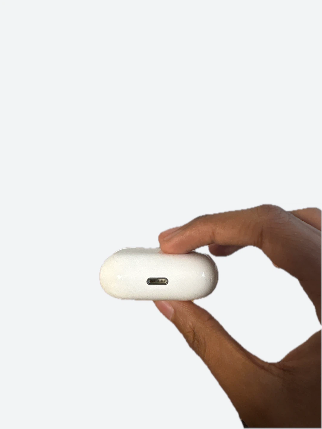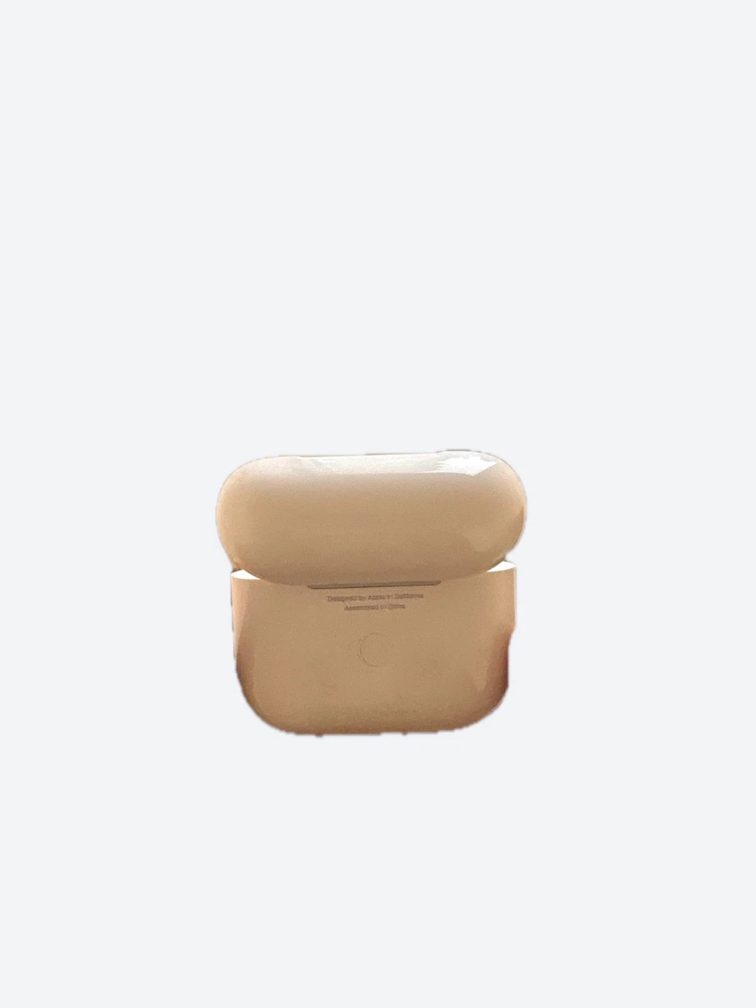 This is an Apple AirPods Pro charging case. It's designed in California and assembled in China. The case uses a Lightning port for charging.