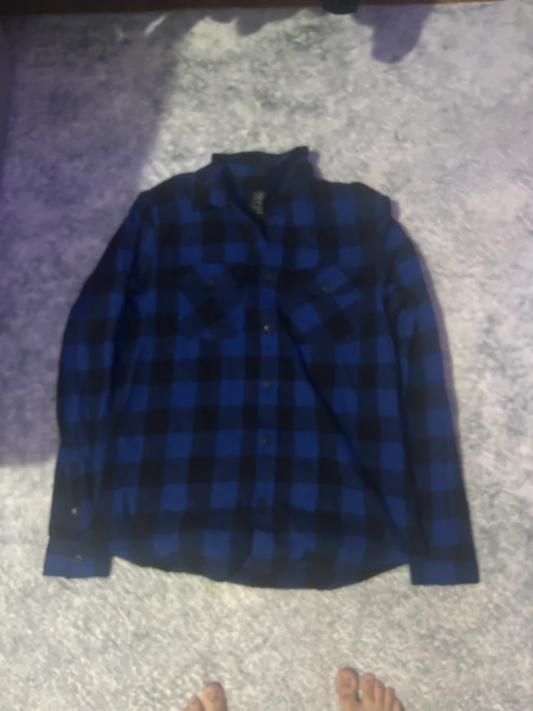 I'm selling a North Western MFG Co. flannel shirt in a blue and black plaid pattern. It's a size small (S). Great for layering or wearing on its own!